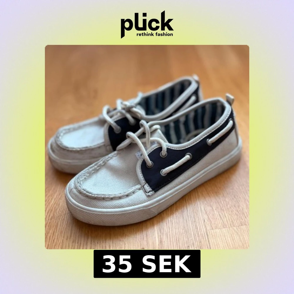Säljer ett par vita sneakers med marinblå detaljer och snörning. Skorna har en låg profil, rund tå och vit platt sula. Insidan är fodrad med randigt tyg i vitt och marinblått. Perfekta för en avslappnad stil.