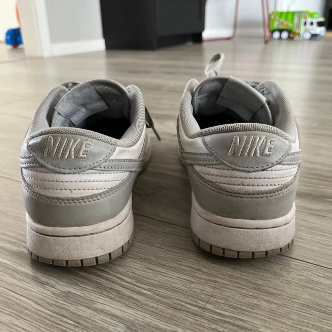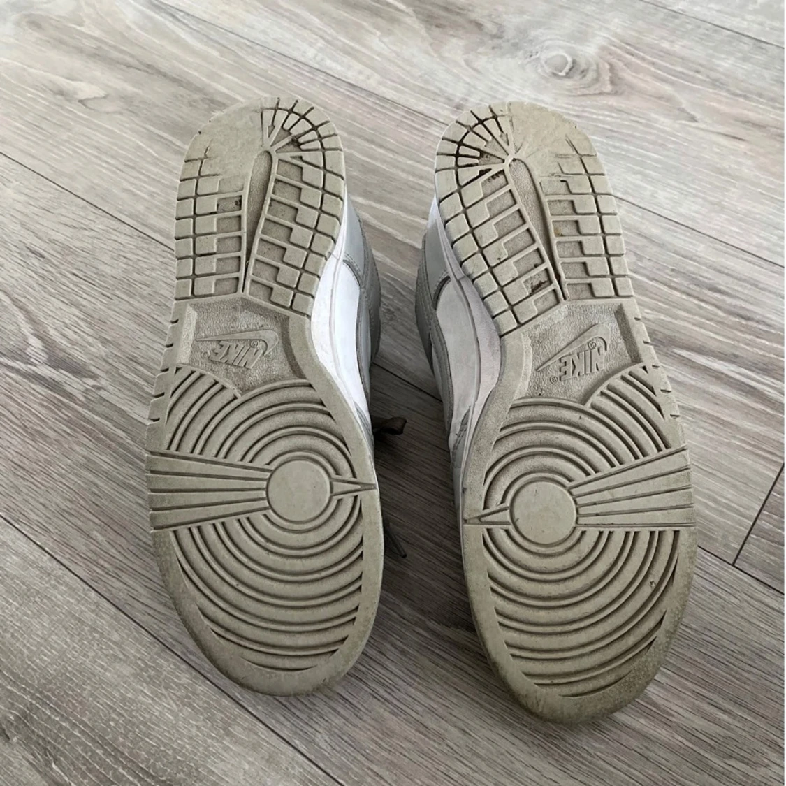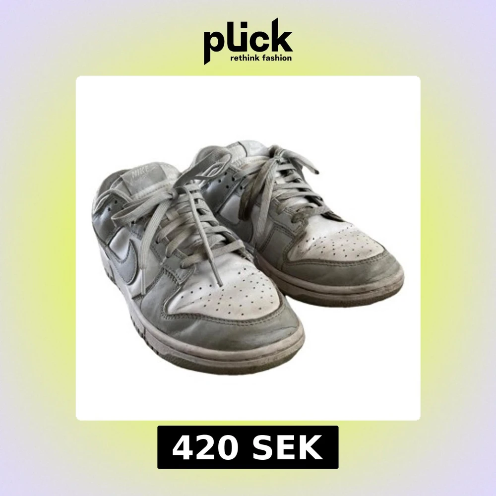 Säljer ett par Nike Dunk Low sneakers i grått och vitt. Skorna har klassisk låg siluett, snörning och rund tå. Perfekta för dig som gillar streetwear och vill ha en stilren look. Swoosh-logga på sidan och Nike-brodyr på hälen. Lite smutsig men det är lugnt. Har försökt att få bort det mesta smuts.