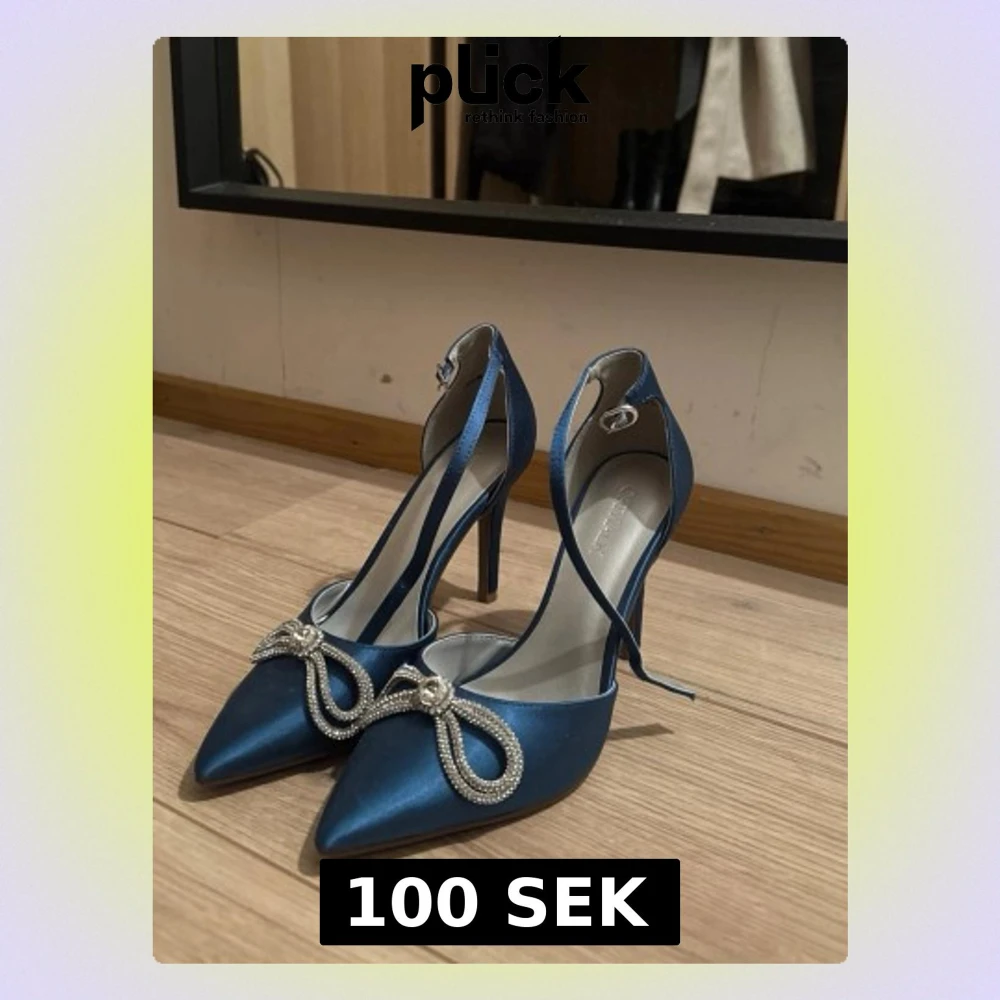 Snygga blå pumps i satin från Catwalk med spetsig tå och hög klack. Skorna har en elegant rem runt vristen och är dekorerade med en glittrig strassrosett framtill. Perfekta för dig som vill sticka ut med lite extra bling.