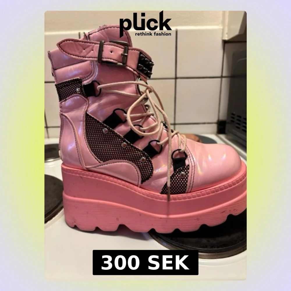 Unika rosa boots med hög platåsula och snörning. Skorna har svarta meshdetaljer, metallnitar och ett spänne med nitar upptill. Tillverkade i glansigt syntetmaterial och har en chunky, edgy look som sticker ut.