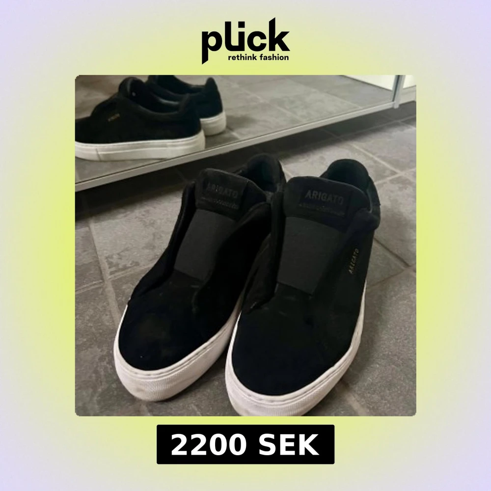 Svarta sneakers från Axel Arigato 360 laceless 39 - Jag säljer ett par Axel arigato i en jätte bra skick I storlek 39 men den är stor I storleken så den kan passa 40 och kanske 41. Nytt pris ligger på 2550 men är  slutsålda typ överallt. Det är  Snygga svarta sneakers från Axel Arigato i mocka. De har en stilren design med diskret logga på sidan och elastiska band över foten för en bekväm passform. Perfekta för en minimalistisk look.