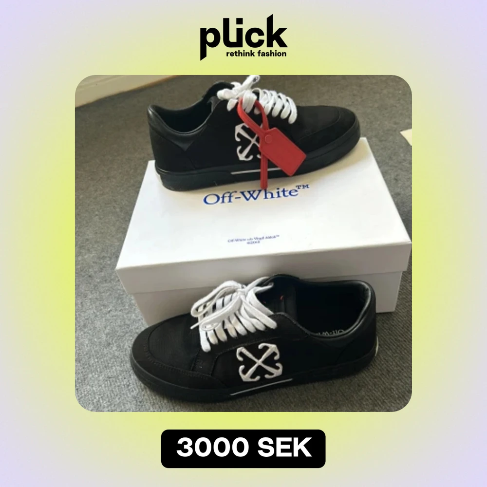 Säljer ett par snygga svarta sneakers från Off-White. De har vita snören och den ikoniska Off-White-loggan på sidan. Skorna är i nyskick och kommer med originalförpackning och dustbag. Perfekta för både vardag och fest!
