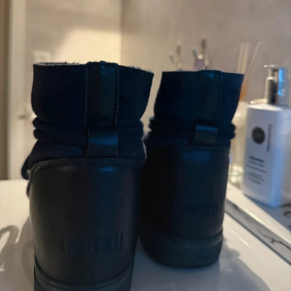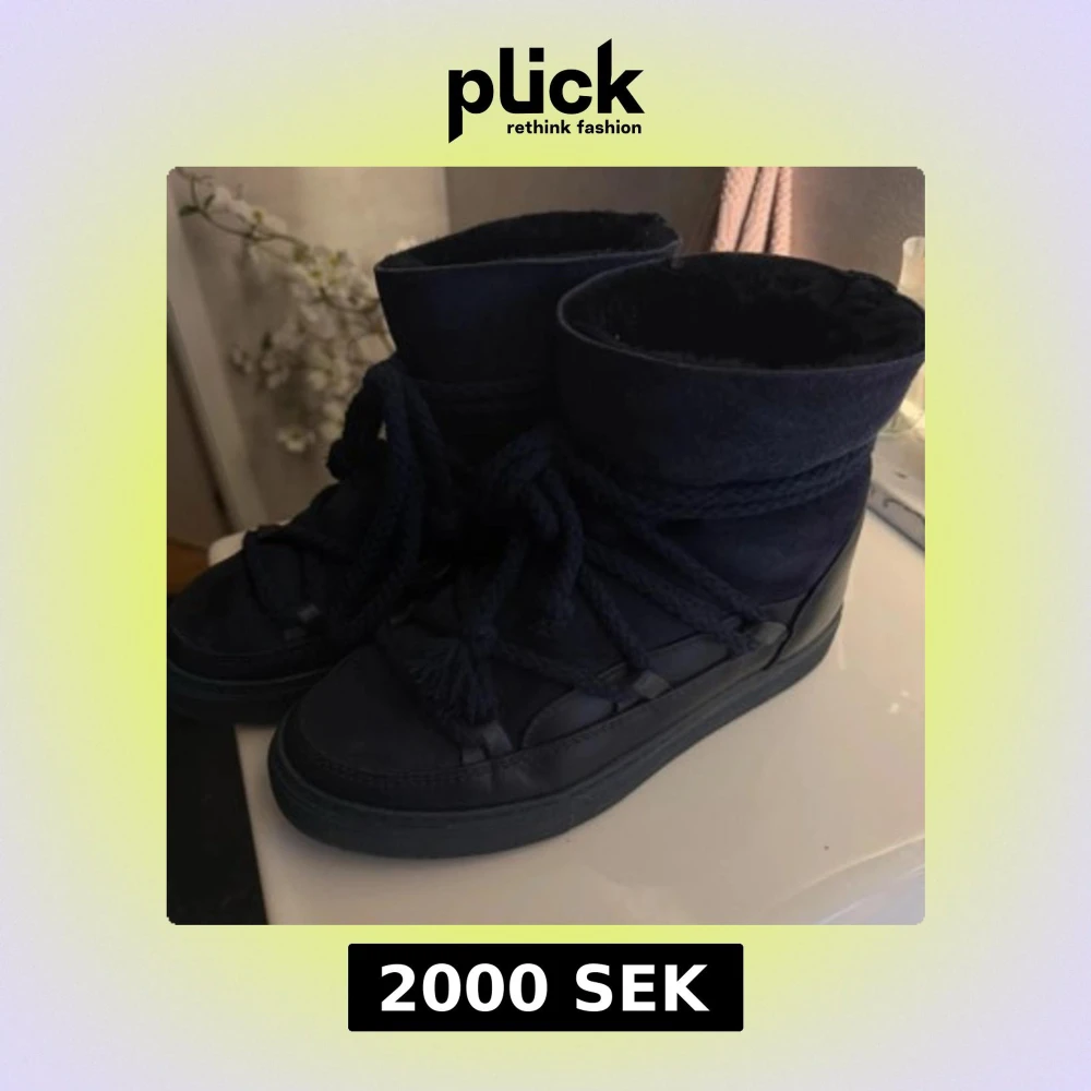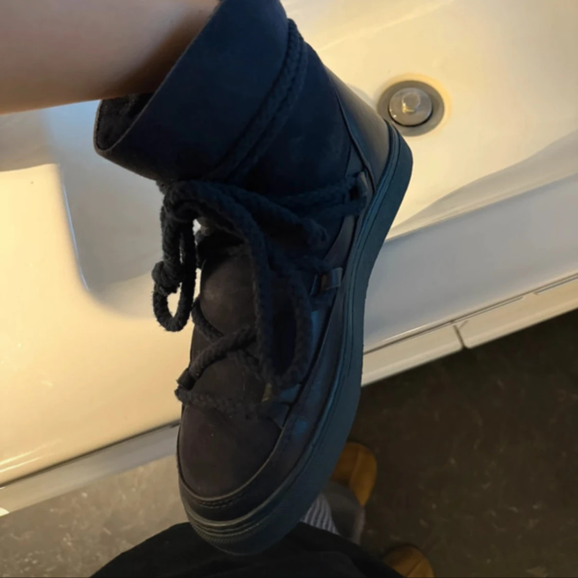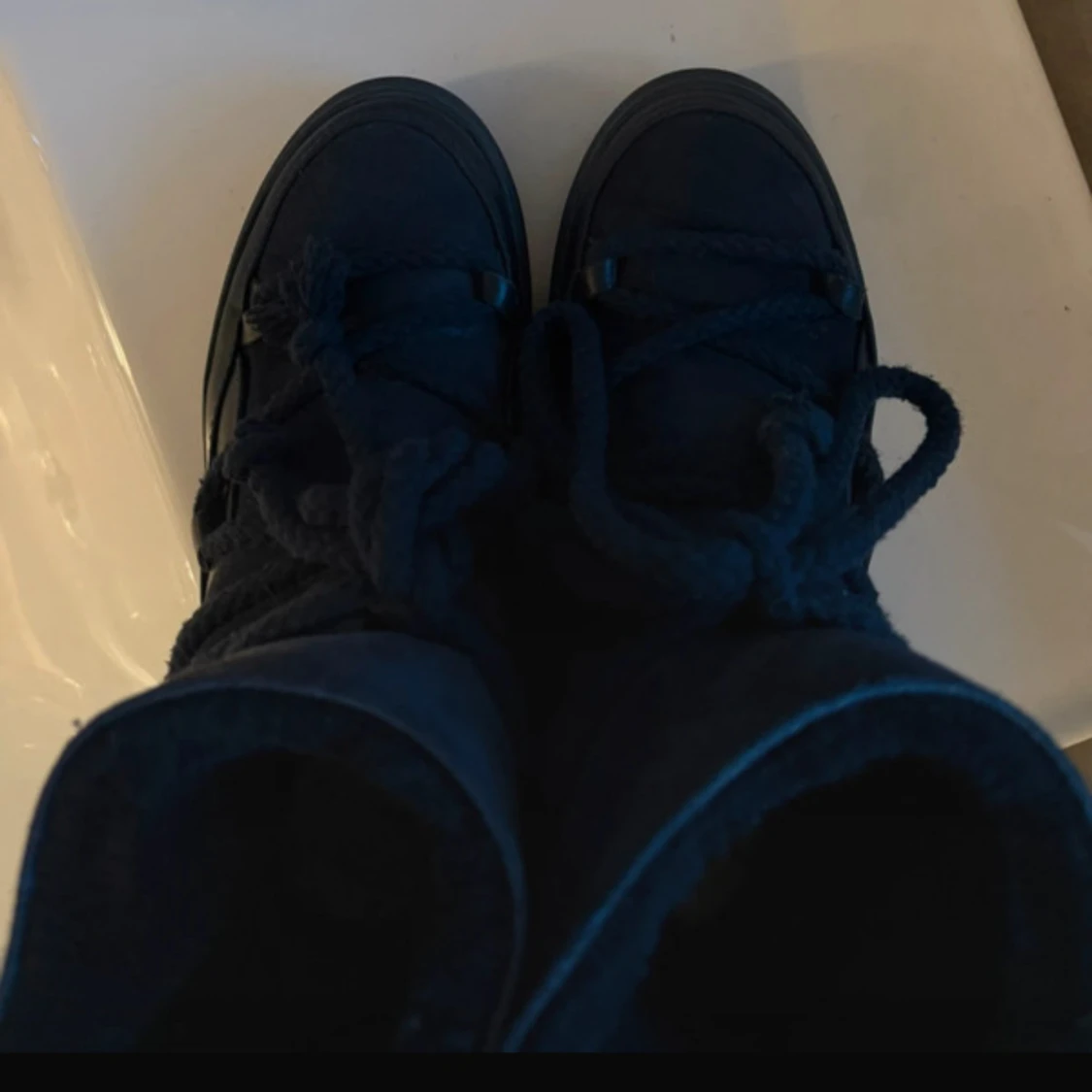 Säljer dessa marinblå Inuikii boots med högt skaft, snörning och platt sula. Skorna är tillverkade i en mix av mocka och skinn, med grova snören som ger en cool look. Jättefint skick!