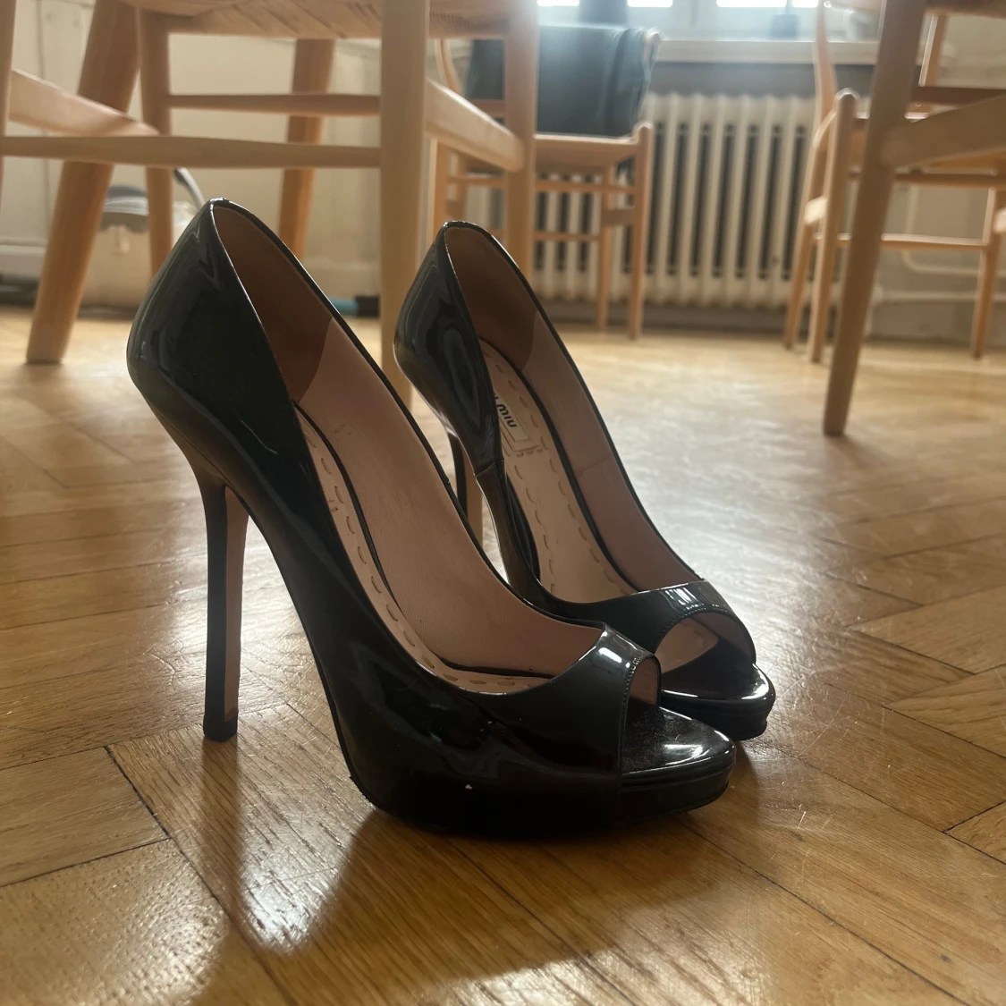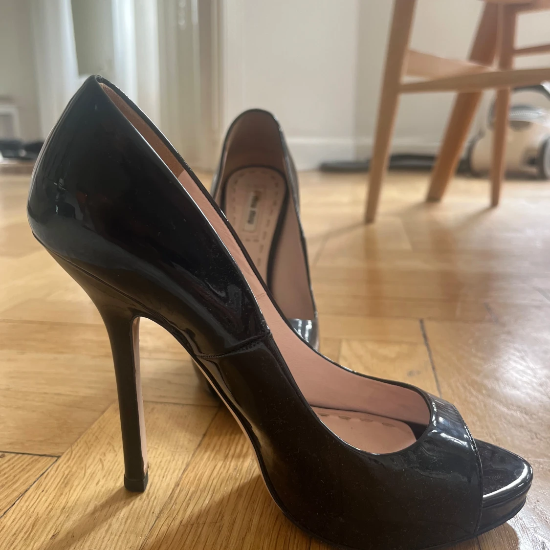 Säljer ett par svarta pumps från Miu Miu i glansigt lackmaterial. Skorna har hög klack, öppen tå och plattform framtill. Perfekta för dig som vill ha en klassisk och elegant look med en modern twist.