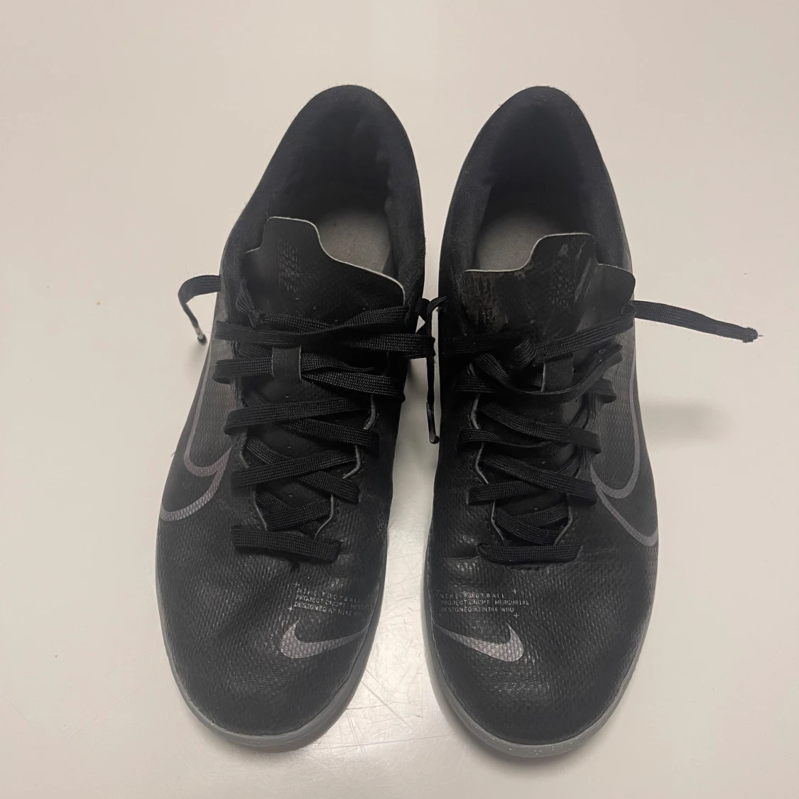 Säljer ett par svarta Nike Mercurial fotbollsskor med silvergrå detaljer och stora Nike-loggor baktill. Skorna har snörning och är tillverkade i syntetmaterial för bästa grepp och känsla på planen. Perfekta för dig som vill sticka ut med en sportig look.