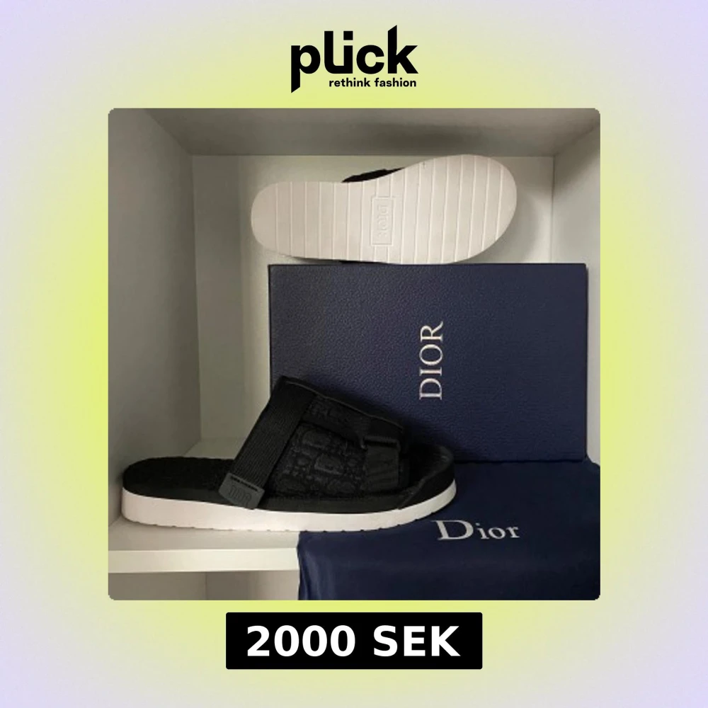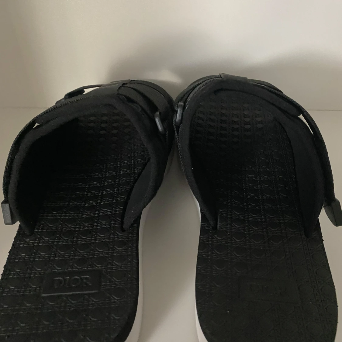 Säljer ett par svarta Dior alpha slides med breda remmar och justerbart spänne. Ovandelen har diskret Dior-mönster och sulan är vit med tydlig Dior-logga undertill. Snygg och modern design, perfekt för sommaren. Skriv vid frågor!!!