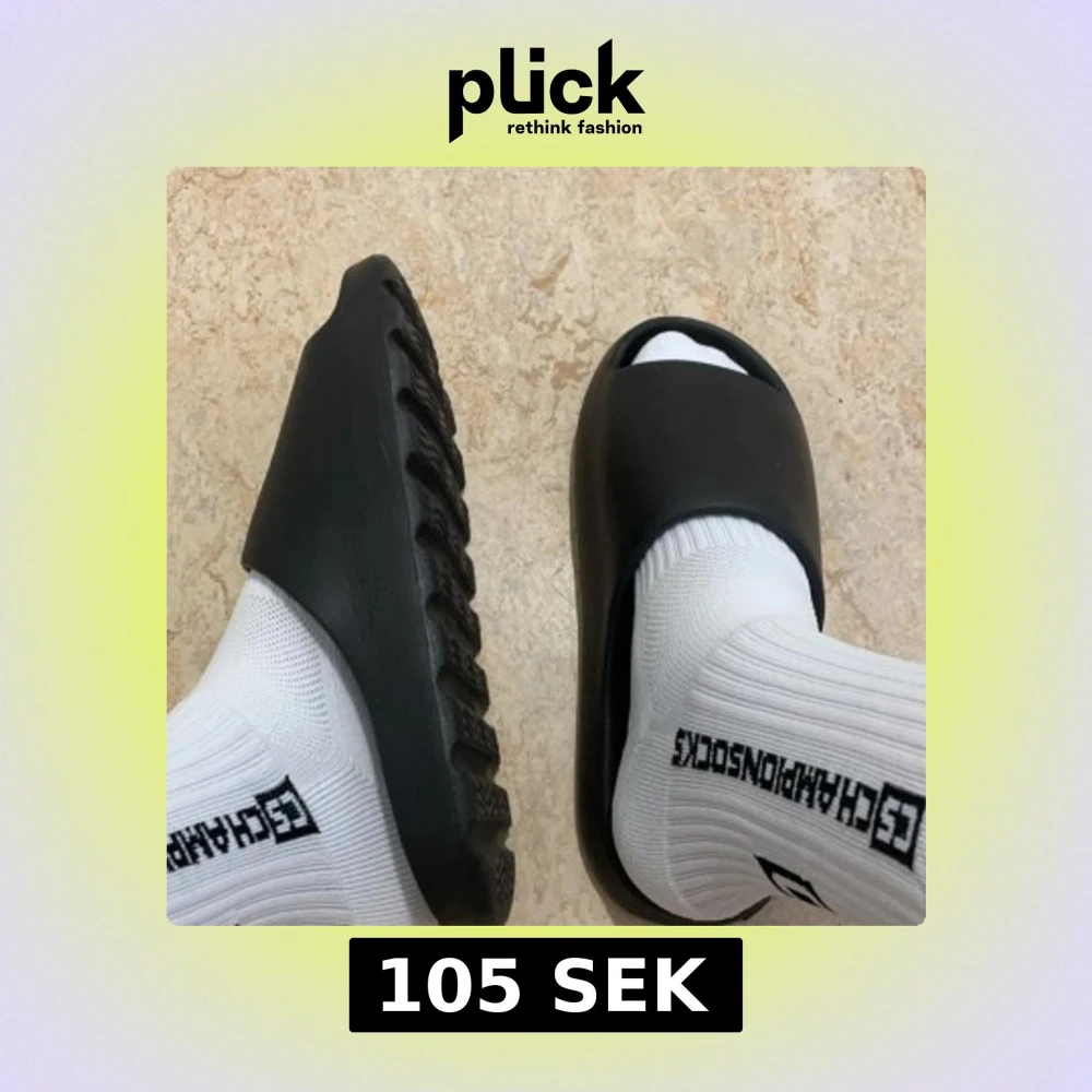 Säljer ett par svarta slides med chunky, räfflad sula. De är tillverkade i syntetmaterial och har en enkel, stilren design utan synliga detaljer. Perfekta för sommaren och autfiten