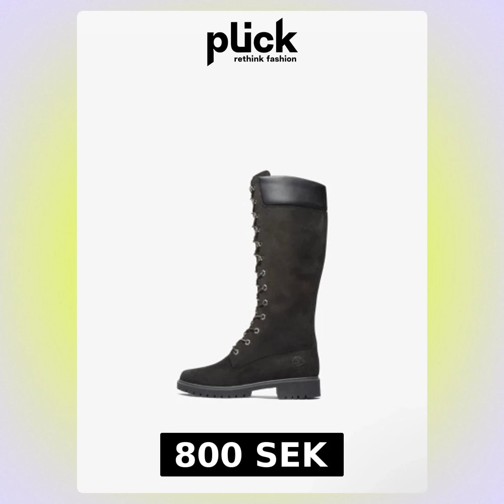 Snygga svarta höga stövlar från Timberland med grov platt sula och snörning hela vägen upp. Tillverkade i mocka med detaljer i skinn upptill. Perfekta för dig som gillar robust stil och vill ha något som sticker ut.