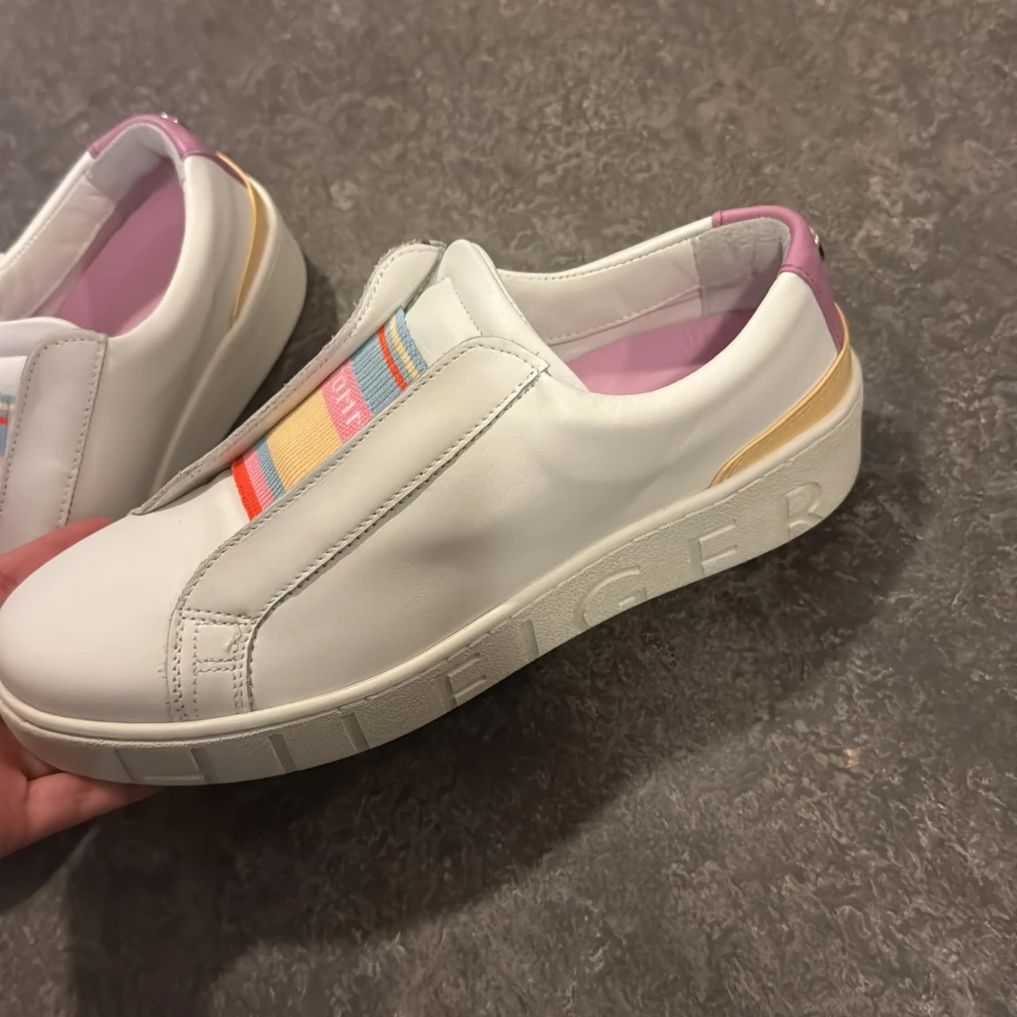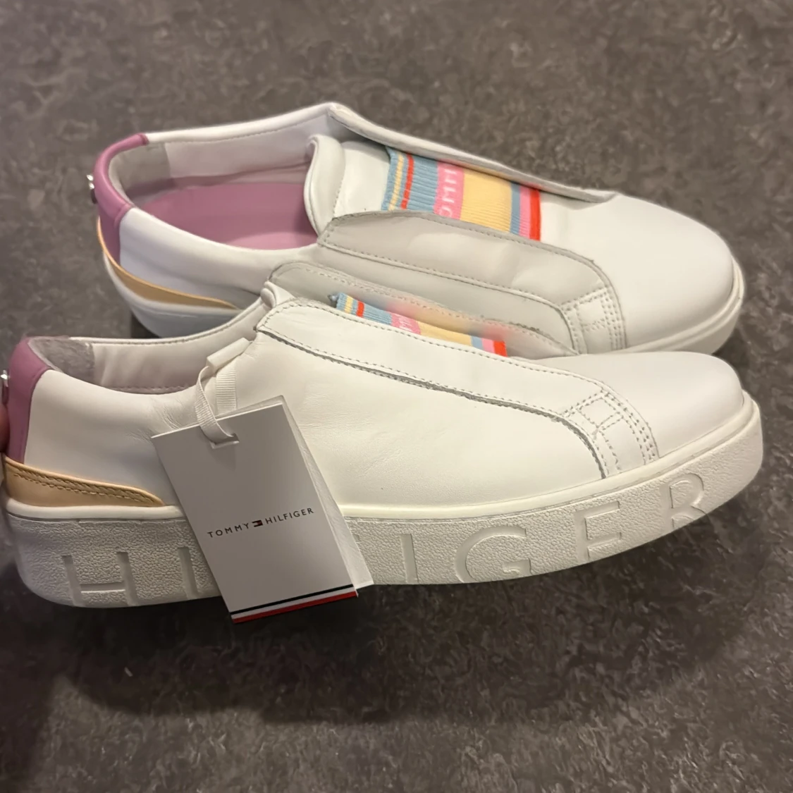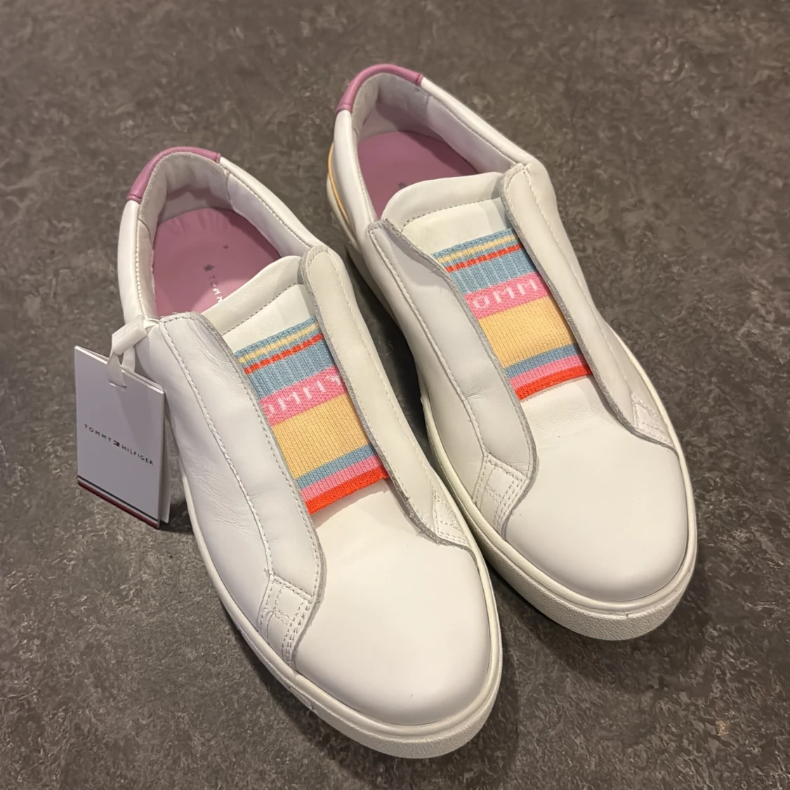 Snygga vita sneakers från Tommy Hilfiger med rund tå och platt sula. Skorna har färgglada elastiska band i pastellfärger över vristen och detaljer i rosa och gult på hälen. Perfekta för dig som gillar stilrena men lekfulla detaljer.
