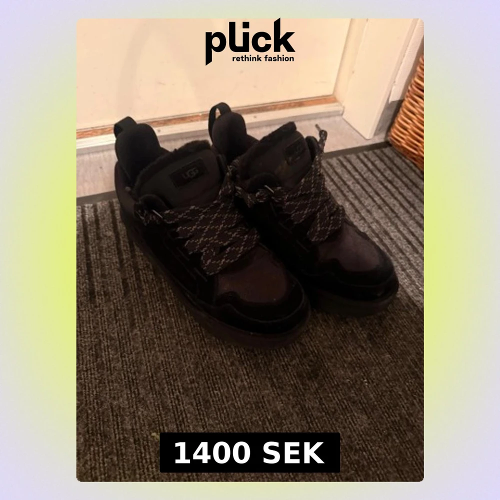 Använda ca 3 gånger box o kvitto finns storlek 45. Svarta sneakers från UGG med tjocka, mönstrade snören och mjuk, fluffig insida. Skorna har rund tå, platt sula och detaljer i mocka och syntet. Perfekta för dig som gillar en sportig och bekväm stil.