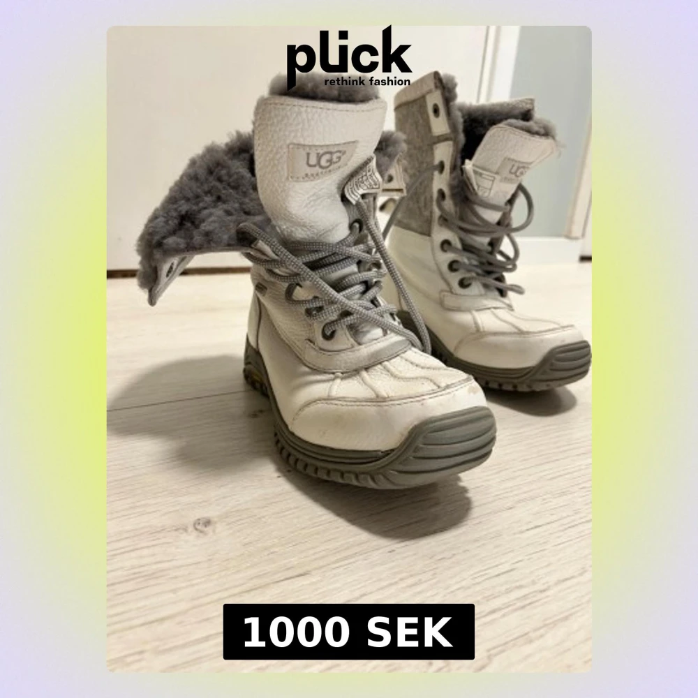 Säljer ett par vita UGG boots med grått ullfoder och snörning. Skorna har robust sula, rund tå och detaljer i både skinn och textil. Går att använda med både nedvikta kanter eller som hög rak känga . Riktigt varma och sköna! Skorna är knappt använda!