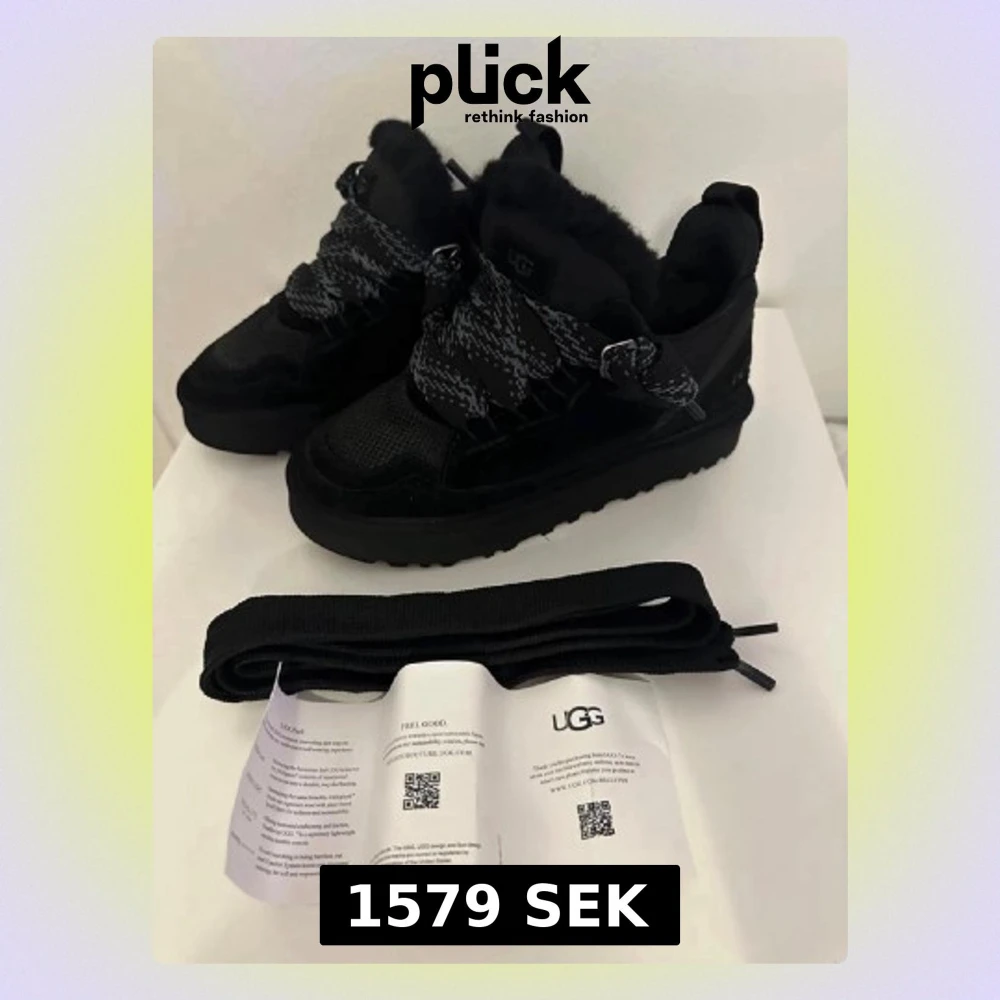 Säljer ett par svarta UGG sneakers med fluffig päls på insidan och grov plattformssula. Skorna har breda, mönstrade snören i svart och grått, UGG-logga på tungan och hälen samt detaljer i mocka och syntet. Perfekt för dig som vill ha både stil och komfort.