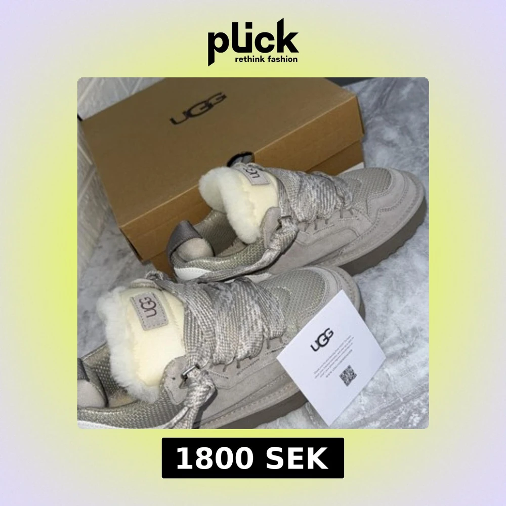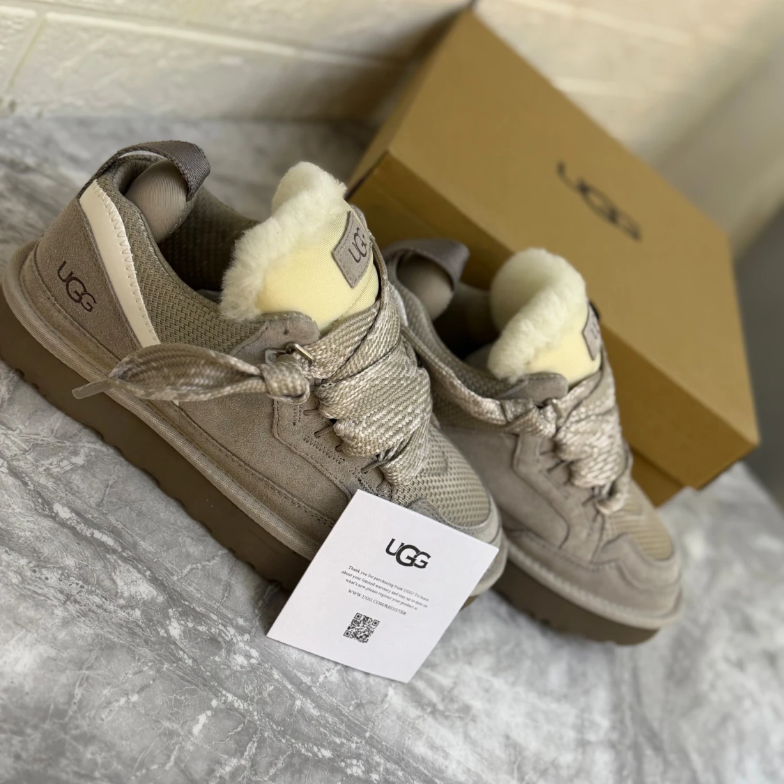Snygga beige sneakers från UGG med breda snören och fluffigt vitt fårskinn på plösen. Ovandelen är i mocka och mesh, med en platt sula i gummi. UGG-logga på plösen och hälen. Perfekta för dig som vill ha både stil och komfort under höst och vinter.