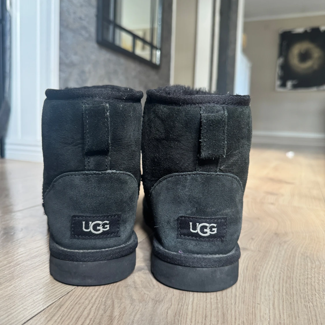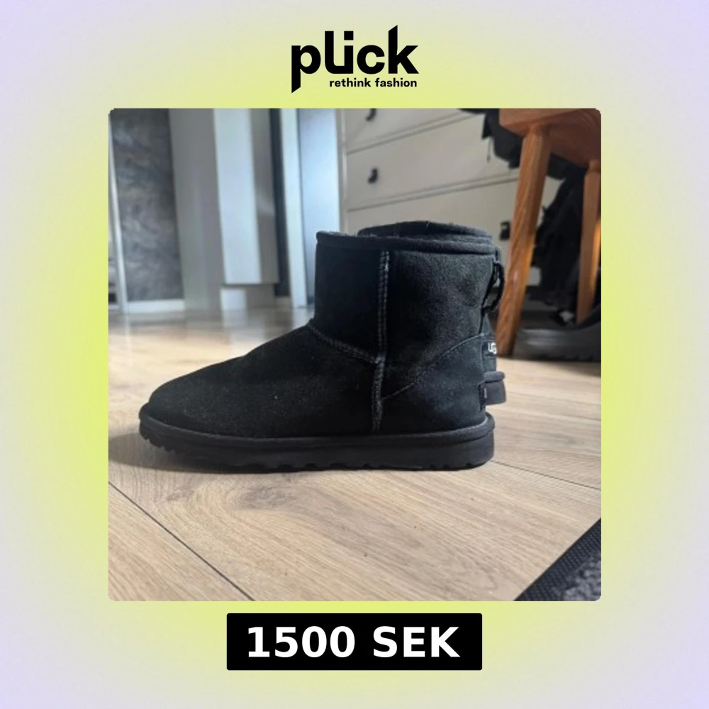 Mysiga svarta UGG boots i mjuk mocka med rund tå och platt sula. Klassisk modell med UGG-logga bak och kort skaft. Perfekta för kalla dagar och riktigt sköna att glida runt i hemma eller ute.
