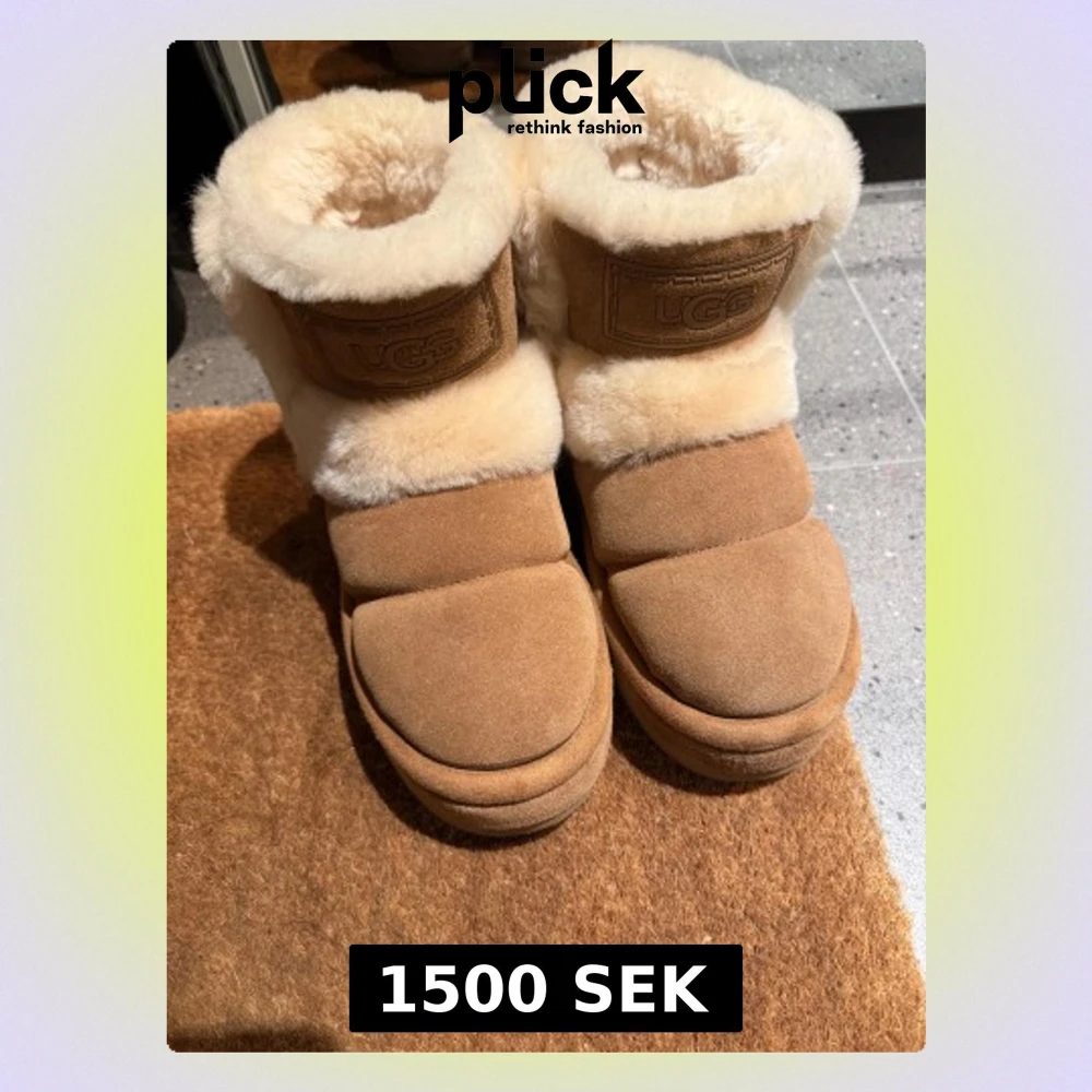 Mysiga UGG boots i beige mocka med fluffigt vitt ullfoder. Klassisk rund tå och platt sula, perfekt för kalla dagar. Bootsens ovandel är i mjuk mocka och insidan är helt fodrad med tjock ull som ger extra värme och komfort. UGG-logga framtill och baktill.