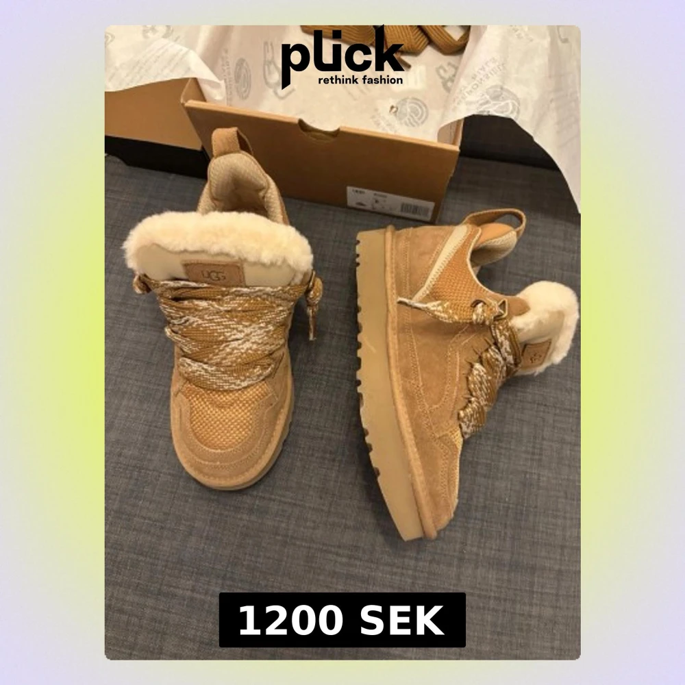 Säljer ett par snygga UGG sneakers i beige med fluffigt fårskinnsfoder och grova, mönstrade snören. Ovandelen är i mocka och textil med robust sula och rund tå. Perfekta för dig som vill ha både stil och komfort under höst och vinter.