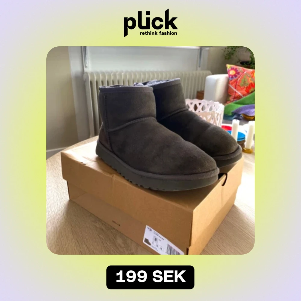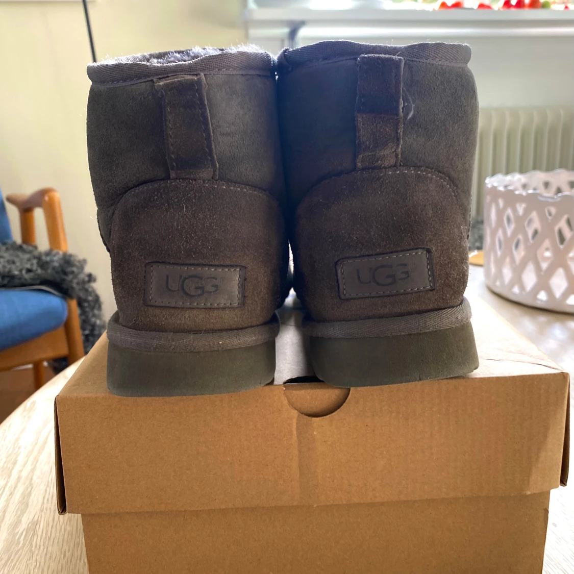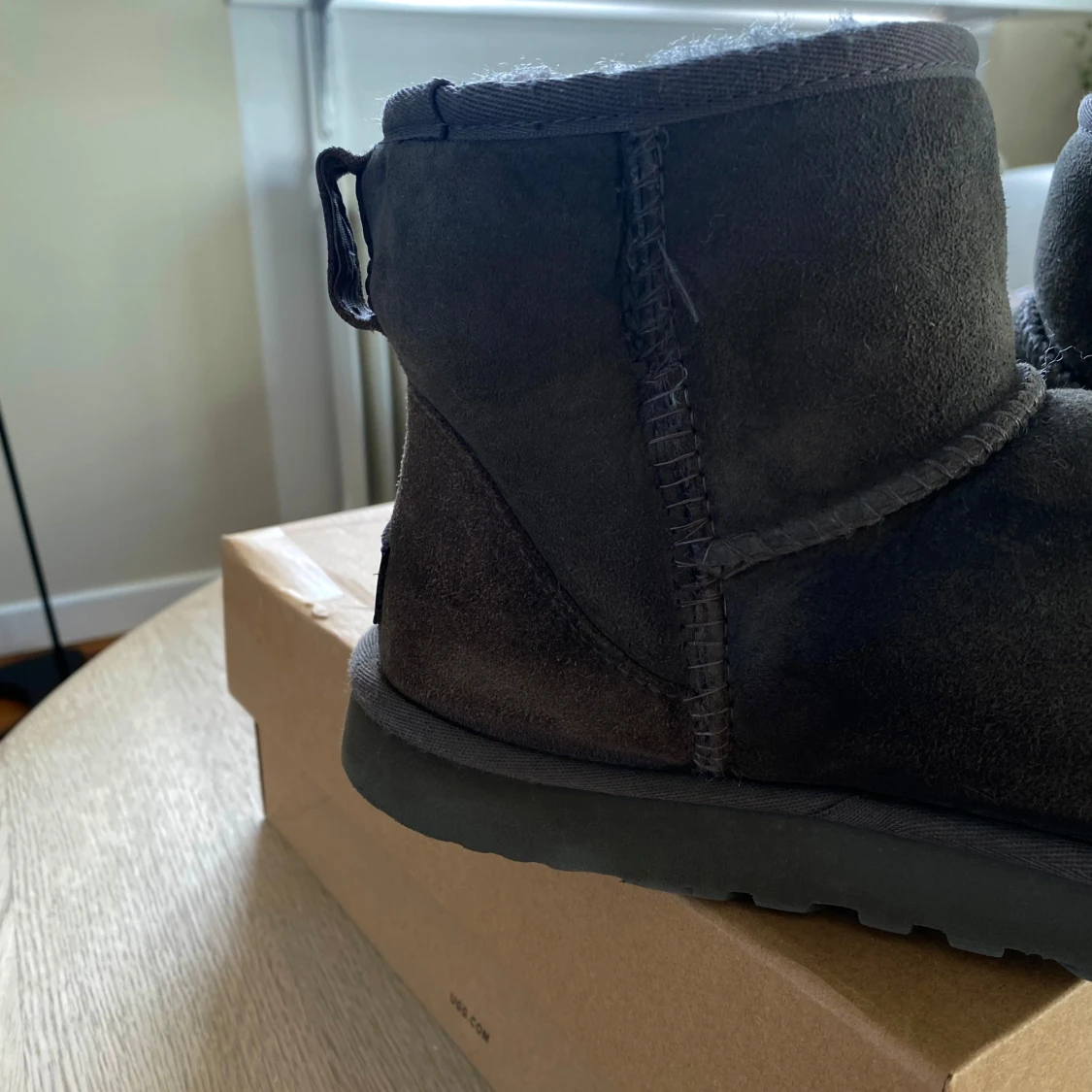Gråbruna UGGs classic mini. Innersidans söm på den vänstra skon har lagats men har hållt bra(se bild) därav priset. UGGs kartongen dom kommer skickas i är inte från de här paret. Såklart äkta