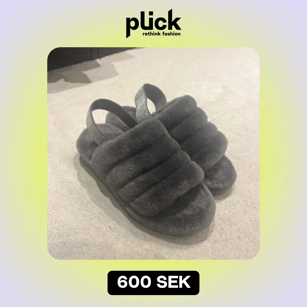 Säljer ett par supermysiga grå sandaler med fluffig päls. De har en bred rem över foten och en elastisk rem runt hälen för extra komfort. Perfekta för att hålla fötterna varma och sköna hemma.