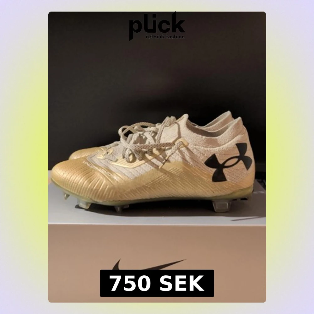 Säljer ett par snygga beige fotbollsskor från Under Armour med svart logga på sidan och bak. Skorna har snörning, stickad ovandel och platt sula med dobbar för bra grepp på planen. Perfekta för dig som vill sticka ut på matchen!