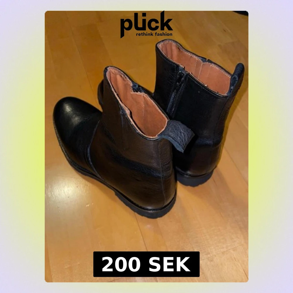 Svarta boots i äkta skinn med grov sula och dragkedja på sidan. De är tillverkade av äkta läder i Spanien för hand. Helt nya och oanvända men saknas låda och lappar. Insidan är fodrad i brunt läder och yttersulan har tydligt mönster för extra grepp. Klassisk rund tå och praktisk flik bak för enkel påtagning. Nypris 1975kr så säljs billigt. Priset är inte hugget i sten. Skriv vid minsta fråga!