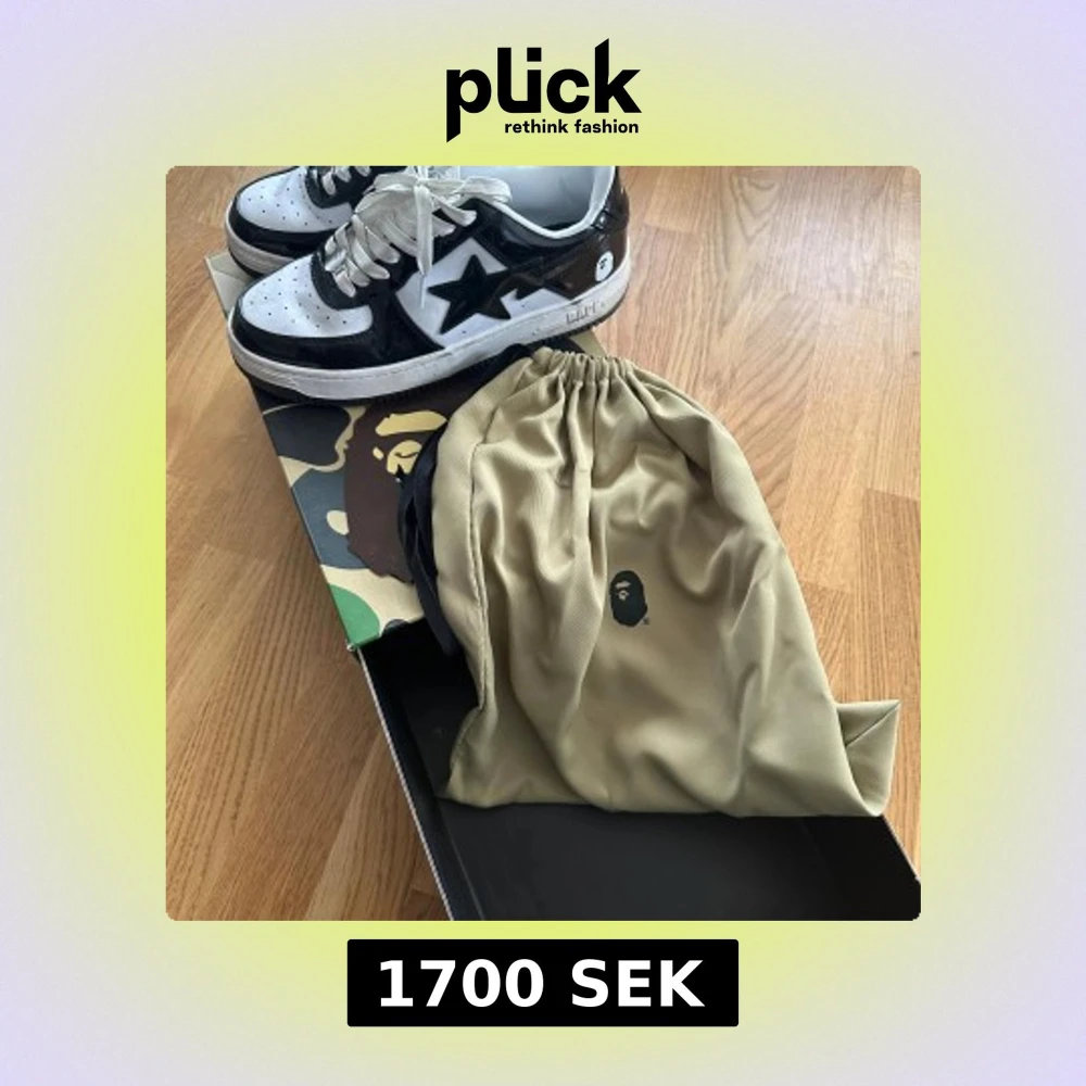 Säljer ett par Bapesta i svart och vitt glossy patentaktigt finish. Kommer med originalkartong och dustbag. OBS! Har inte kvitto eftersom jag har FÅTT mina skor som present men är till 99% att de är äkta