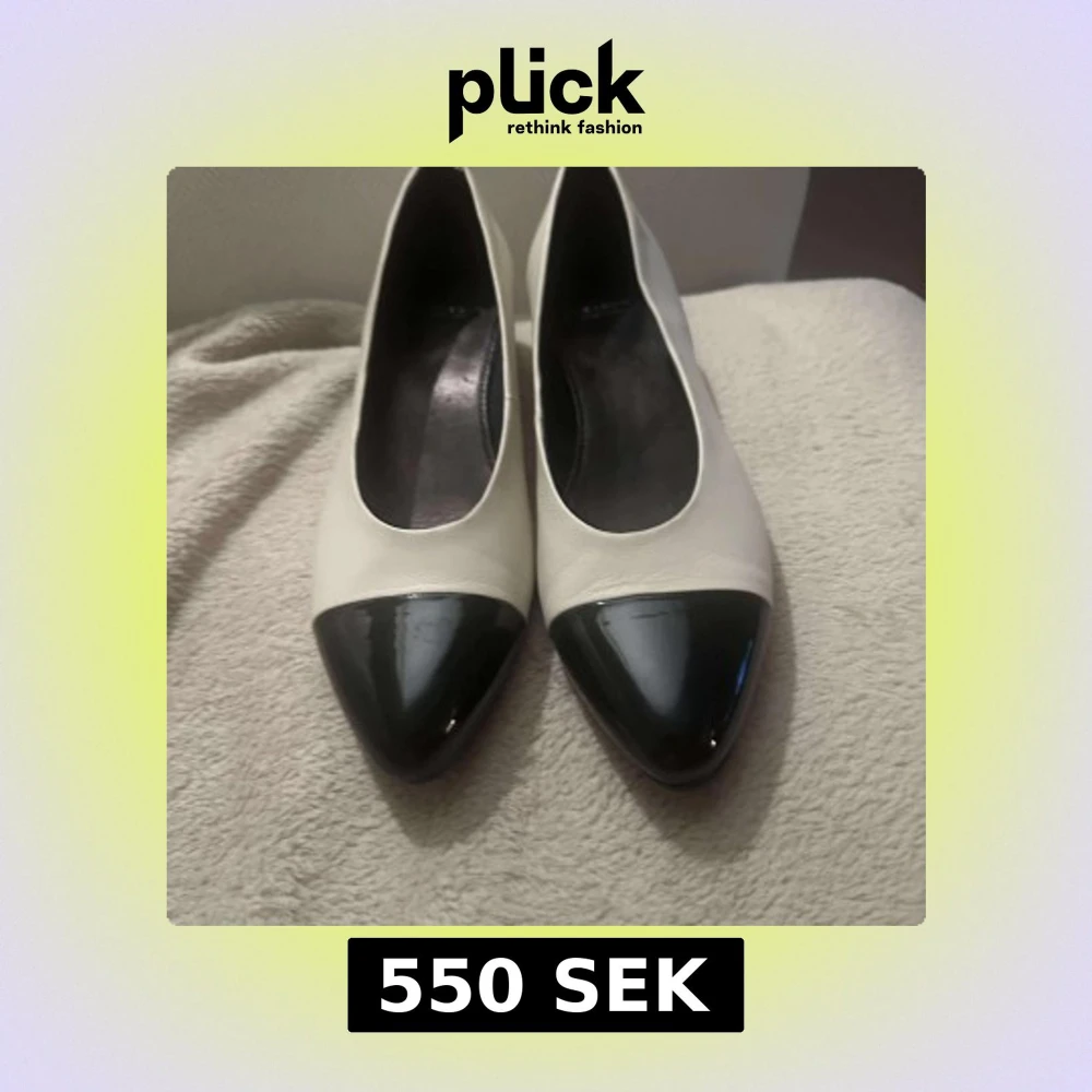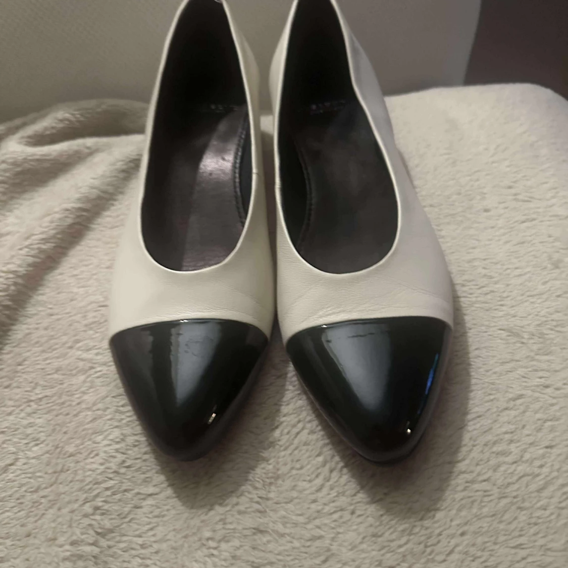 Säljer ett par stilrena pumps från Vagabond i vitt skinn med svart, glansig tå. Skorna har låg klack och rundad öppning, vilket ger en klassisk och chic vibe. Perfekt för dig som gillar minimalistisk design med en twist.