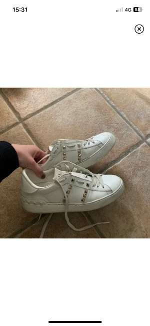 Valentino sneakers - Säljer ett par vita Valentino Rockstud sneakers i skinn med i nitar. Alla nitar sitter kvar, de defekter som finns är att de är lite slitna (tappat lite färg längst fram) men annars inga konstigheter storlek 37 brukar ha storlek 36/37 men de är lite stora så hade oxå passat än 38🥰