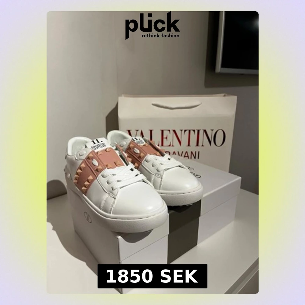 Säljer ett par Valentino sneakers i vitt skinn med ljusrosa band och ikoniska nitar. Skorna har rund tå, snörning och platt sula. Perfekta för dig som vill ha en lyxig och edgy touch till din outfit.