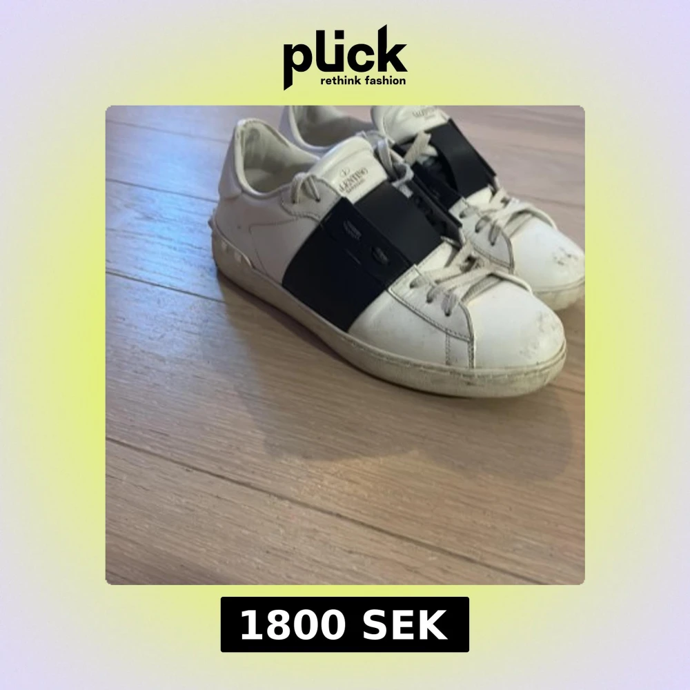 Snygga Valentino Garavani Open sneakers i vitt skinn med bred svart rem över vristen och coola nitar på hälen. Klassisk rund tå, vita snören och platt sula. Perfekta för dig som gillar lyxiga och stilrena sneakers med en edgy twist.