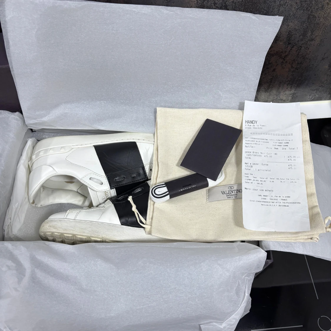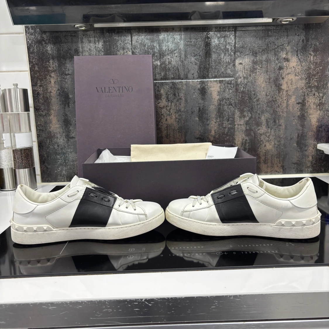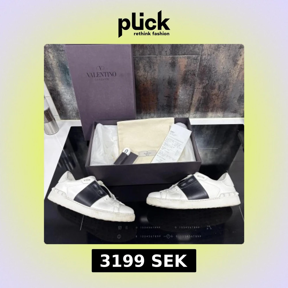 Snygga vita sneakers från Valentino Garavani med bred svart läderdetalj över sidan. Klassisk rund tå, snörning och platt sula med nitar baktill. Skorna är i skinn och har en stilren, lyxig vibe. Kommer med originalkartong, dustbag, extra snören och kvitto