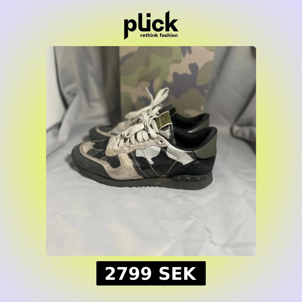 Snygga Valentino Rockrunner sneakers med grå, svarta och beige camouflagepaneler i mocka och skinn. Platt sula med nitar på hälen, rund tå och snörning framtill. Ikonisk logga på plösen och cool armykänsla. Perfekt för dig som gillar streetstyle och designer.