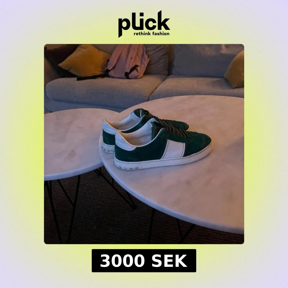 Byte!!!!!Snygga Valentino flycrew sneakers i grön mocka och vit skinn med coola nitar runt sulan. Klassisk låg modell med snörning och rund tå. Perfekt för dig som vill sticka ut med exklusiva detaljer och lyxig känsla.