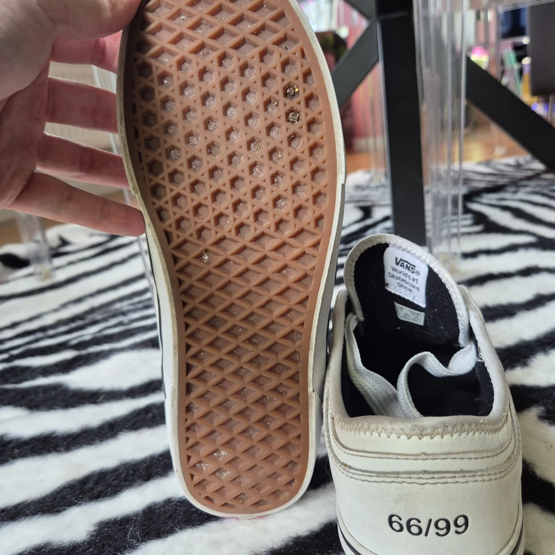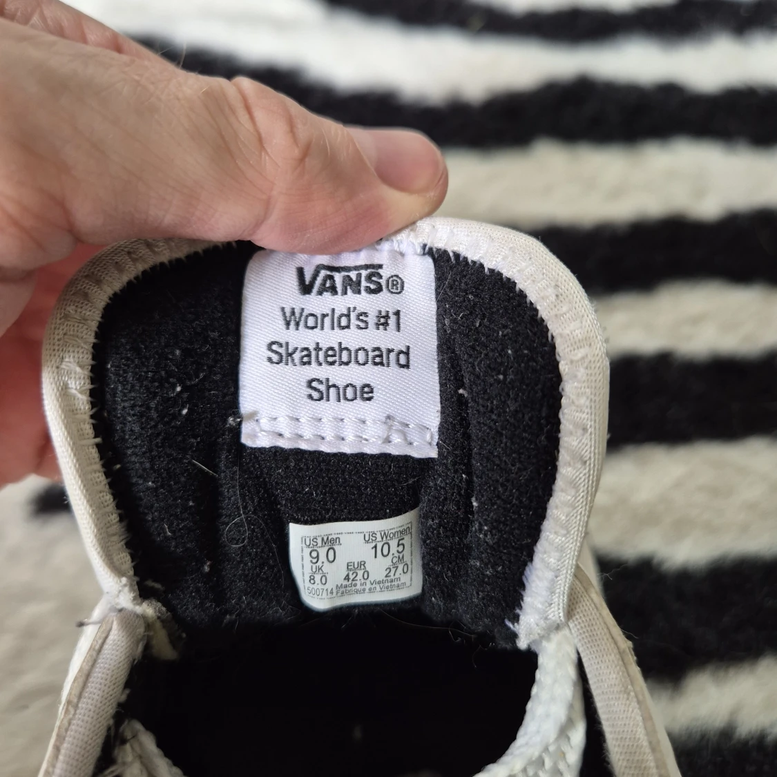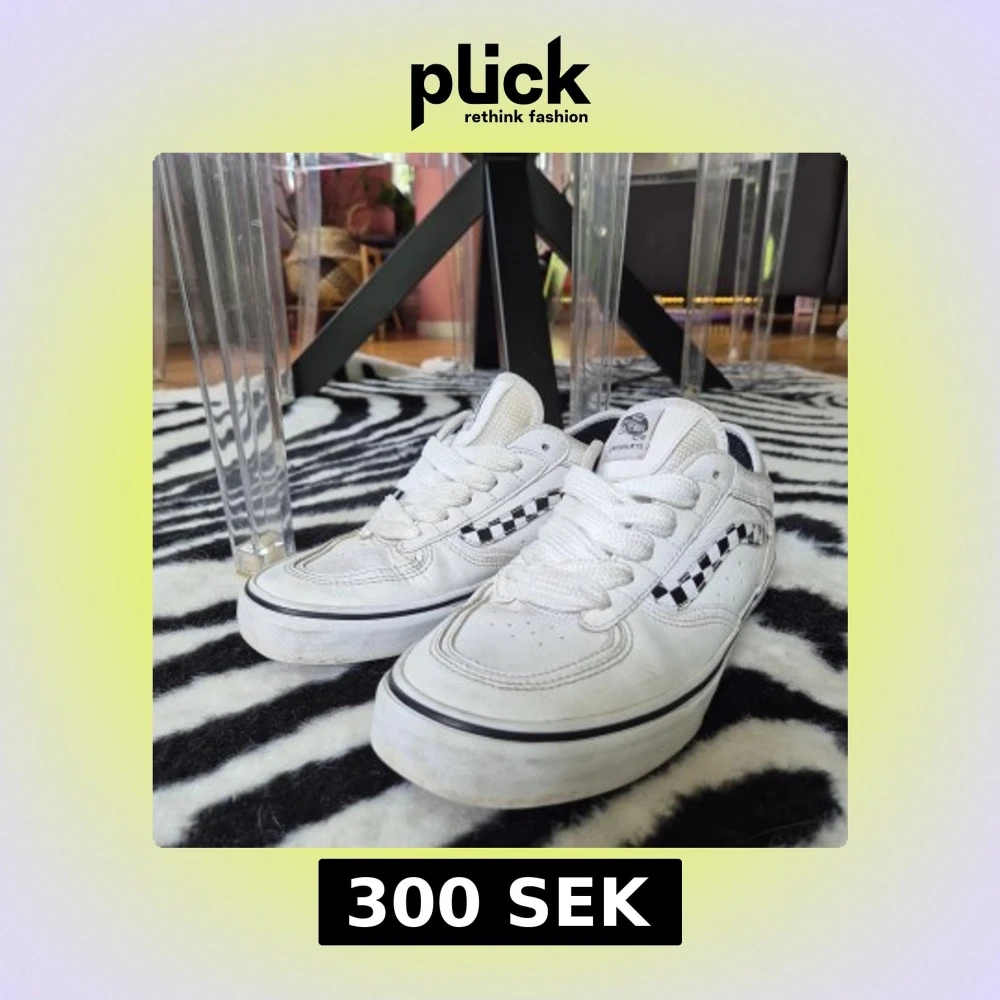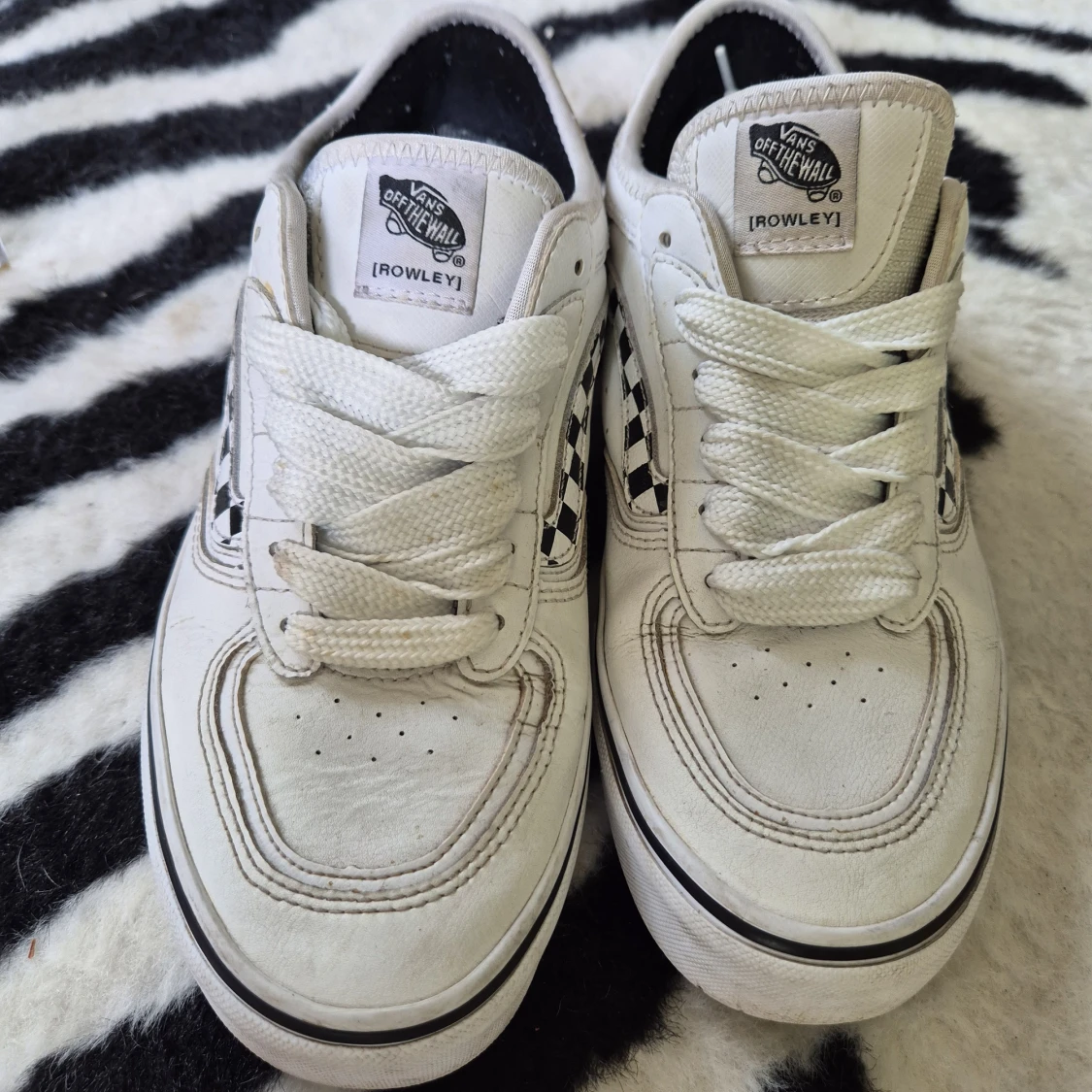 Säljer ett par Vans Rowley sneakers i vitt med klassiskt rutigt mönster på sidan. Skorna har snörning, platt sula och rund tå. Ovandelen är i slitstark skinn och textil, med svart och vit färgdetalj. Perfekta för skate och streetstyle. Sulan är gummibrun med ikoniskt mönster.