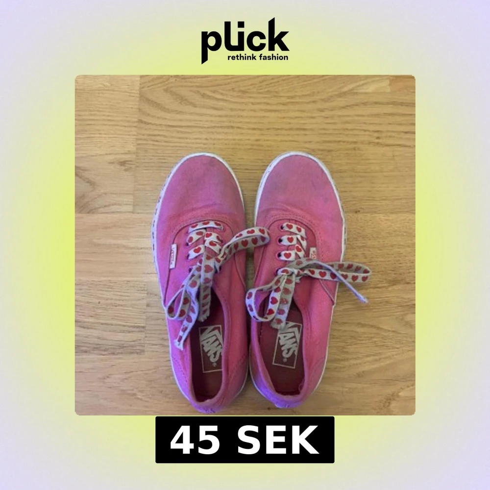 Är inte i så bra skick men går att tvätta på vissa ställen. Säljer ett par rosa Vans sneakers i tyg med vita sulor dekorerade med röda hjärtan. Skosnörena är grå med röda hjärtan, vilket ger en gullig och unik look. Klassisk rund tå och platt sula, perfekta för dig som vill sticka ut lite extra.