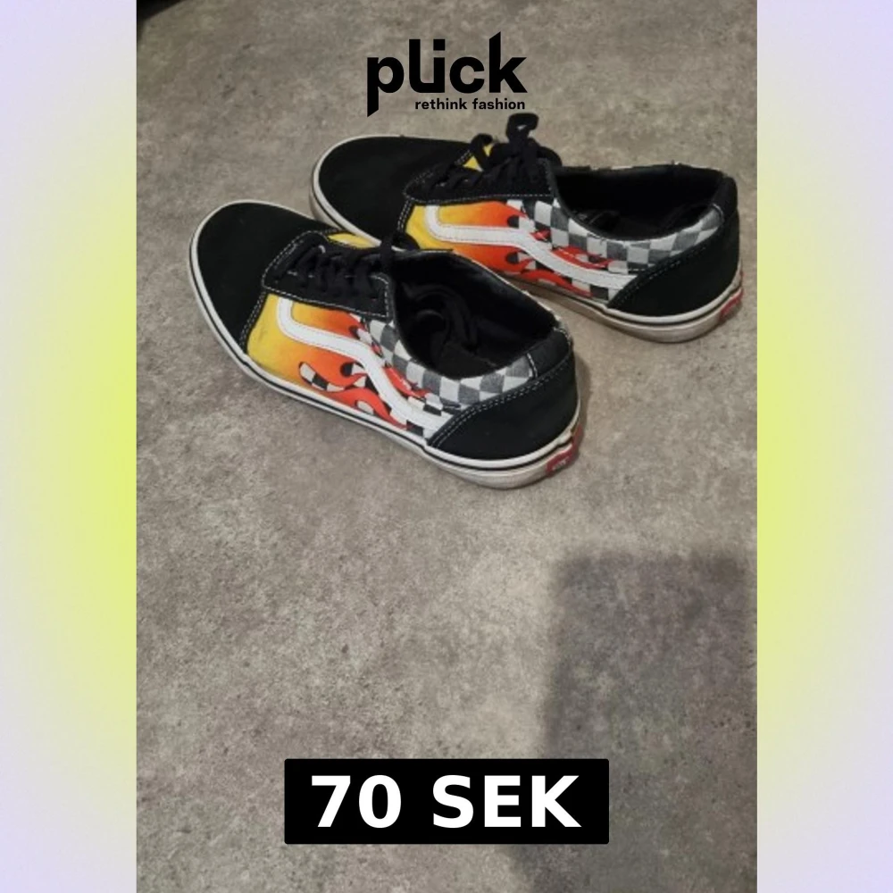 Säljer ett par Vans Old Skool sneakers med svart tå och häl, klassisk vit sula och snörning. Sidorna har ett schackrutigt mönster i grått och vitt, samt coola orange och röda flames. Materialet är canvas och skinn, med rund tå och platt sula.