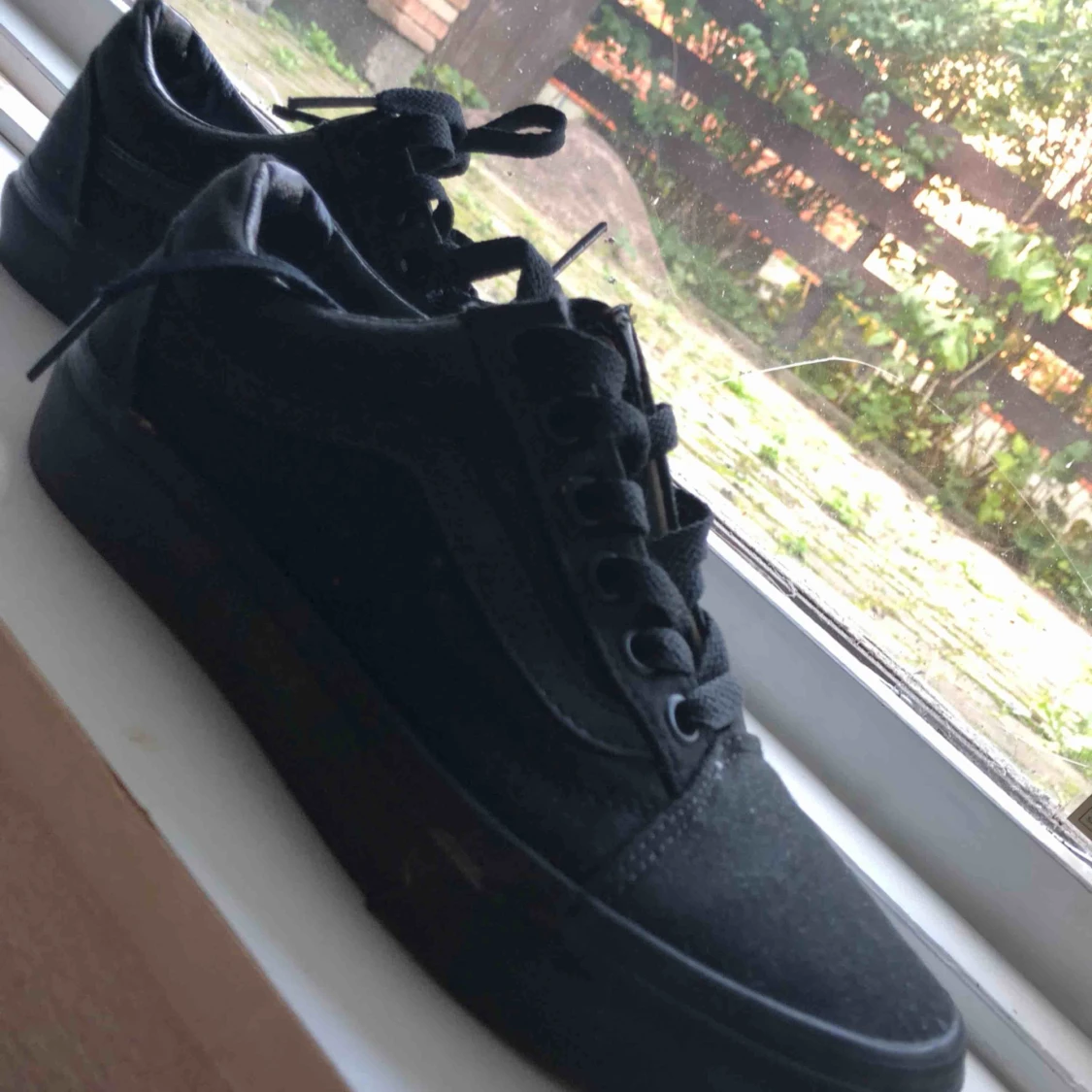 Helsvarta vans, pyttelite smutsiga men endast använda en gång. Säljer pga att dom är för små :( Frakt tillkommer i priset.