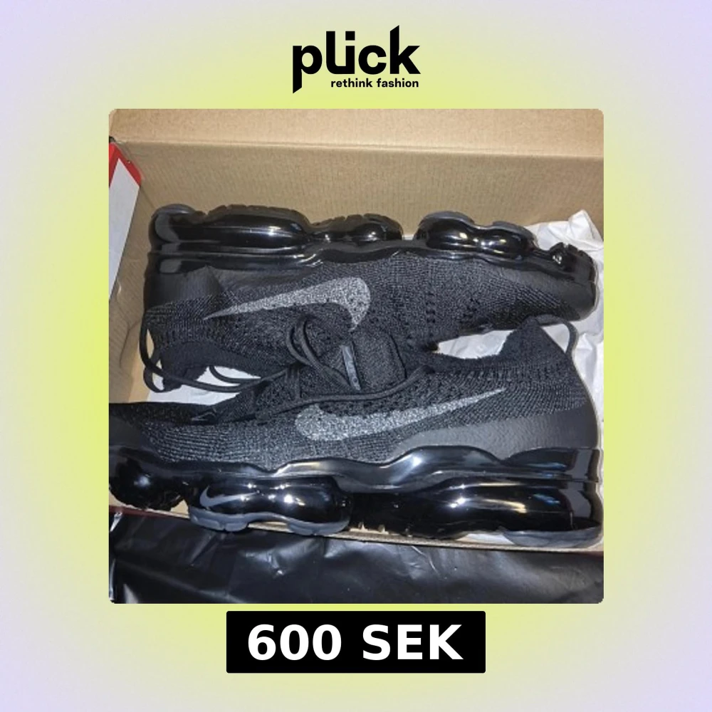 Svarta Nike Vapormax sneakers med stickad ovandel och silvrig swoosh på sidorna. Skorna har en unik, genomskinlig och bubblig sula som ger en futuristisk vibe. Perfekta för dig som gillar streetstyle och vill ha något som sticker ut.
