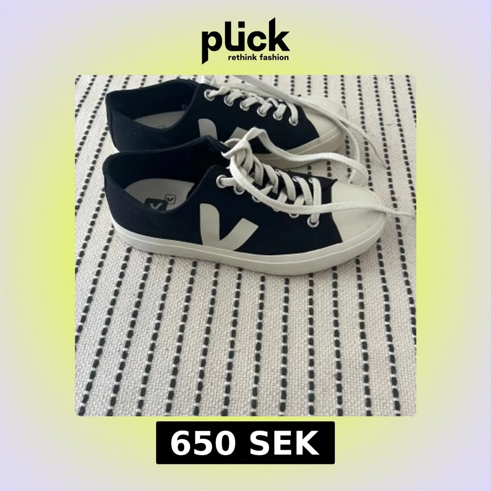 Snygga svarta sneakers från Veja med vit sula. Använda 2 gånger!, köpte i butik för 1400, därav 650kr. Storlek 41 men skulle säga att dem sitter som 40