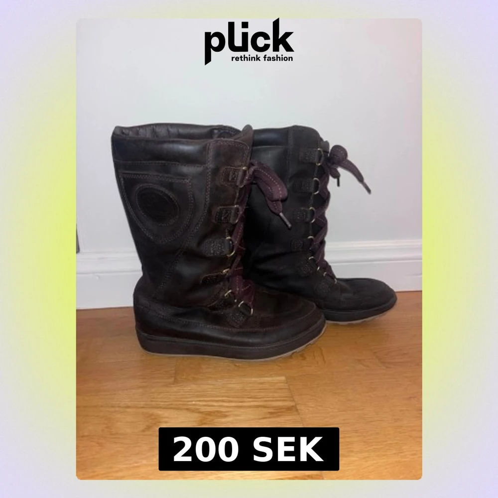 Säljer ett par bruna höga boots från Timberland med grov sula och mörkbruna snören. Skorna har rund tå, snörning framtill och robust design som passar perfekt för kalla dagar. Klassisk Timberland-logga på sidan och slitstark yttersula.