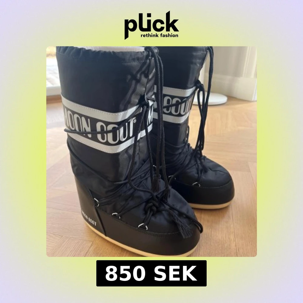 Säljer ett par svarta Moon Boots med snörning och vit logga. Knappast kommit till användning Perfekta för vintern med sin robusta design och varma foder. De har en hög modell som ger extra skydd mot kyla och snö. Passar bra för kalla dagar och snöiga äventyr.