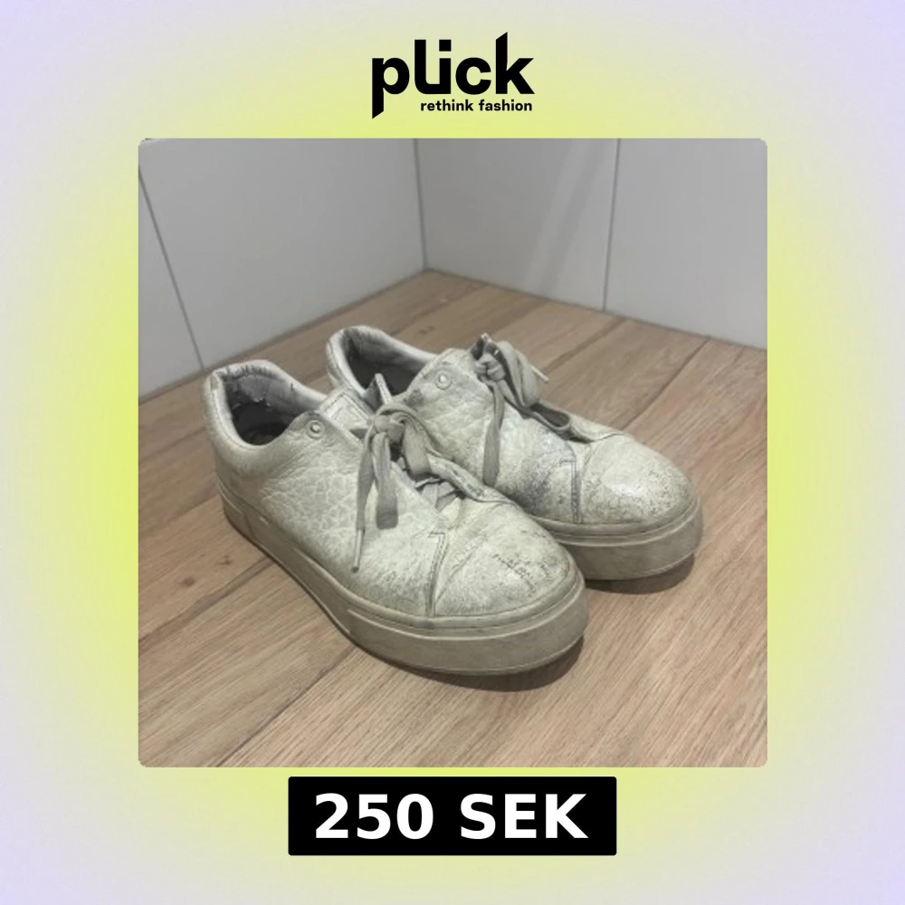 Säljer ett par vita sneakers med platt sula och rund tå. Skorna har snörning och är tillverkade i skinn med en krackelerad yta som ger en cool vintagekänsla. Perfekt för dig som gillar chunky och stilrena sneakers i ljus färgton. Slitna