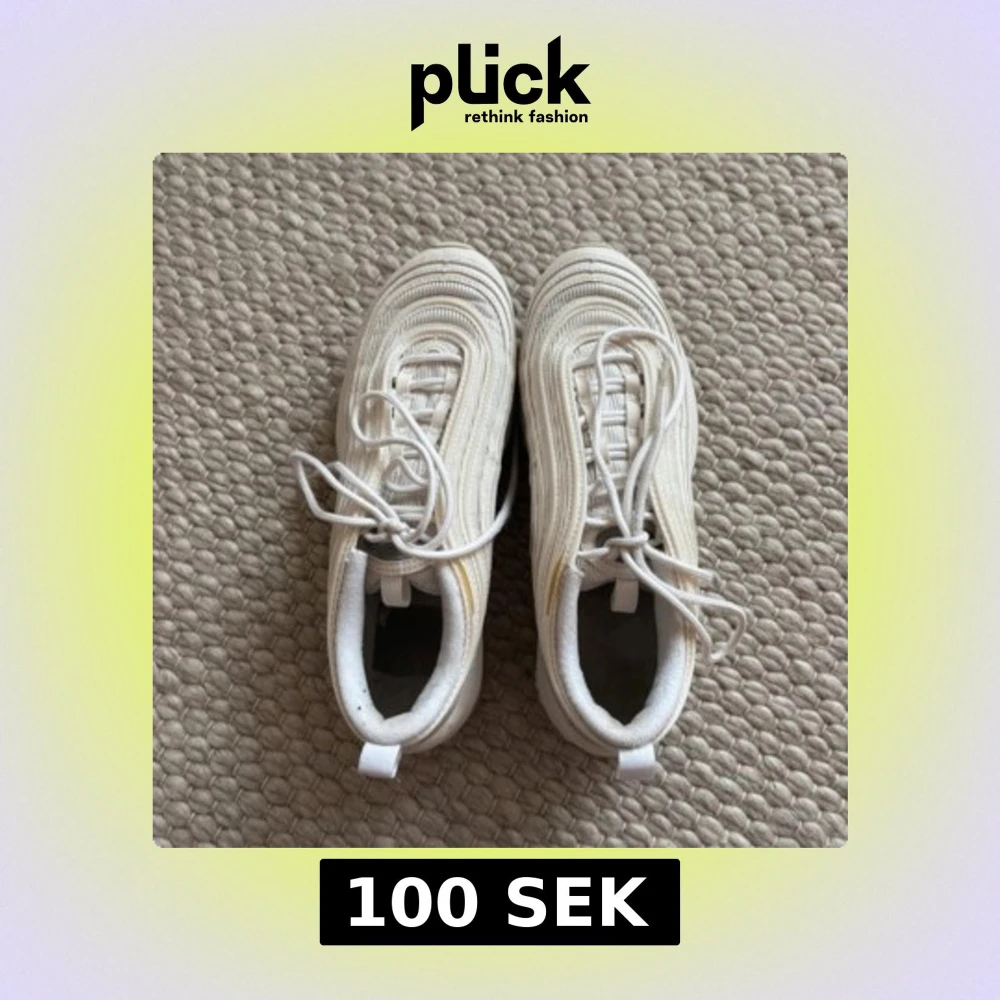 Säljer ett par vita Nike sneakers med synlig luftdämpning i sulan och klassisk snörning. Skorna har en stilren design med Nike-loggan på sidan.