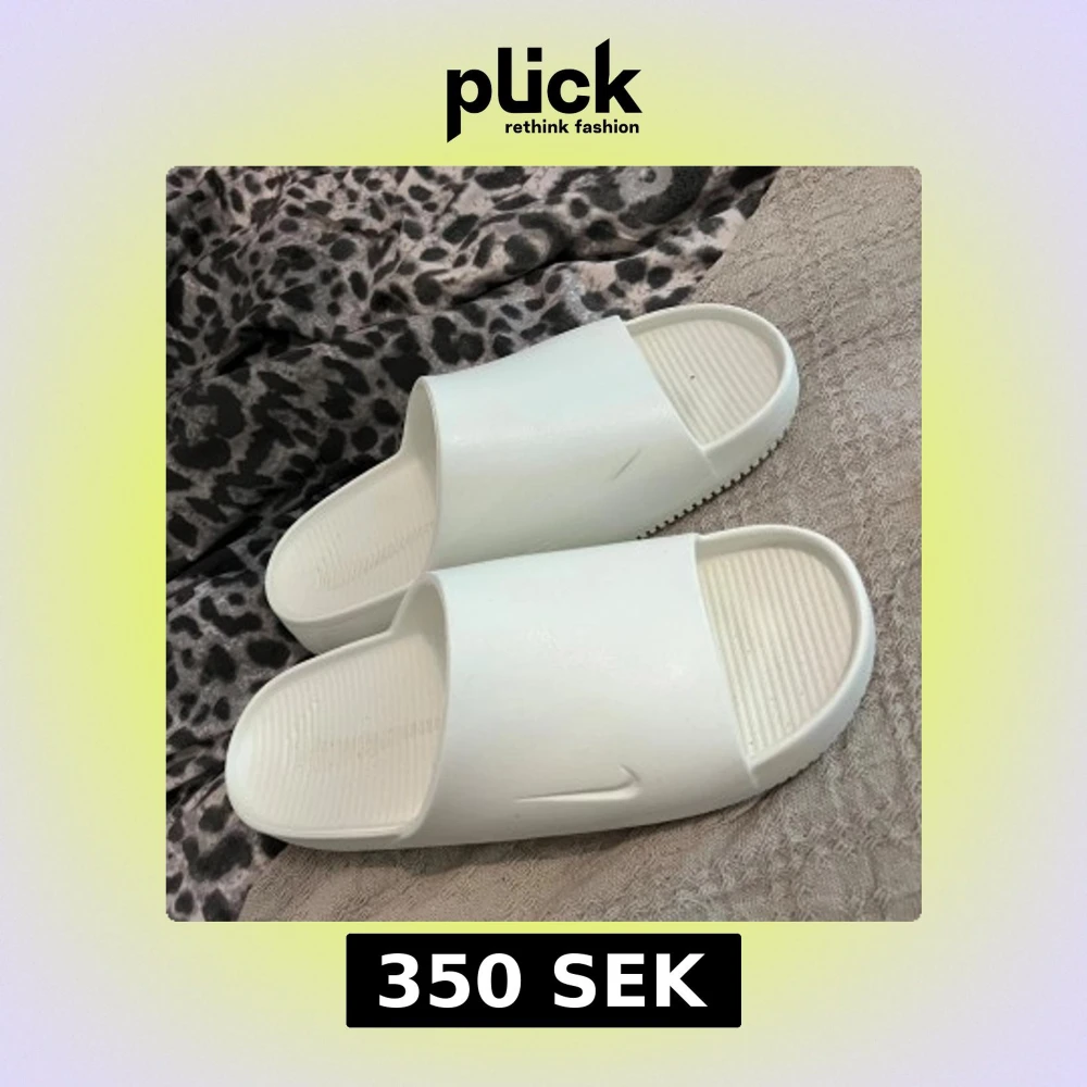 Säljer ett par stilrena vita Nike slides i syntetmaterial. De har en enkel och clean design med öppen tå och diskret Nike-logga på sidan. Perfekta för sommaren eller att chilla hemma. Ribbad sula för extra grepp.