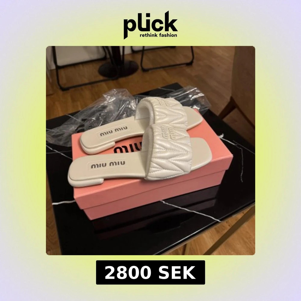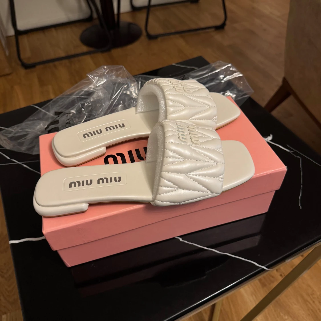Säljer ett par vita sandaler från Miu Miu med quiltad ovandel och logotyp på både rem och sula. Sandalerna har en platt sula och en stilren, modern design med fyrkantig tå. Perfekta för sommarens alla tillfällen och riktigt snygga till både jeans och klänning.