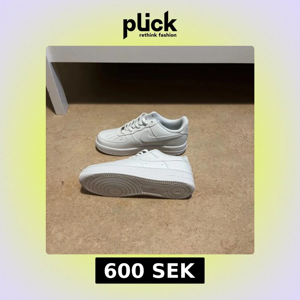 Säljer ett par klassiska vita Nike Air Force 1 sneakers. Skorna har en stilren design med perforerad tå, snörning och låg profil. Perfekta för dig som vill ha en clean och tidlös look. Passar till det mesta och är riktigt bekväma.