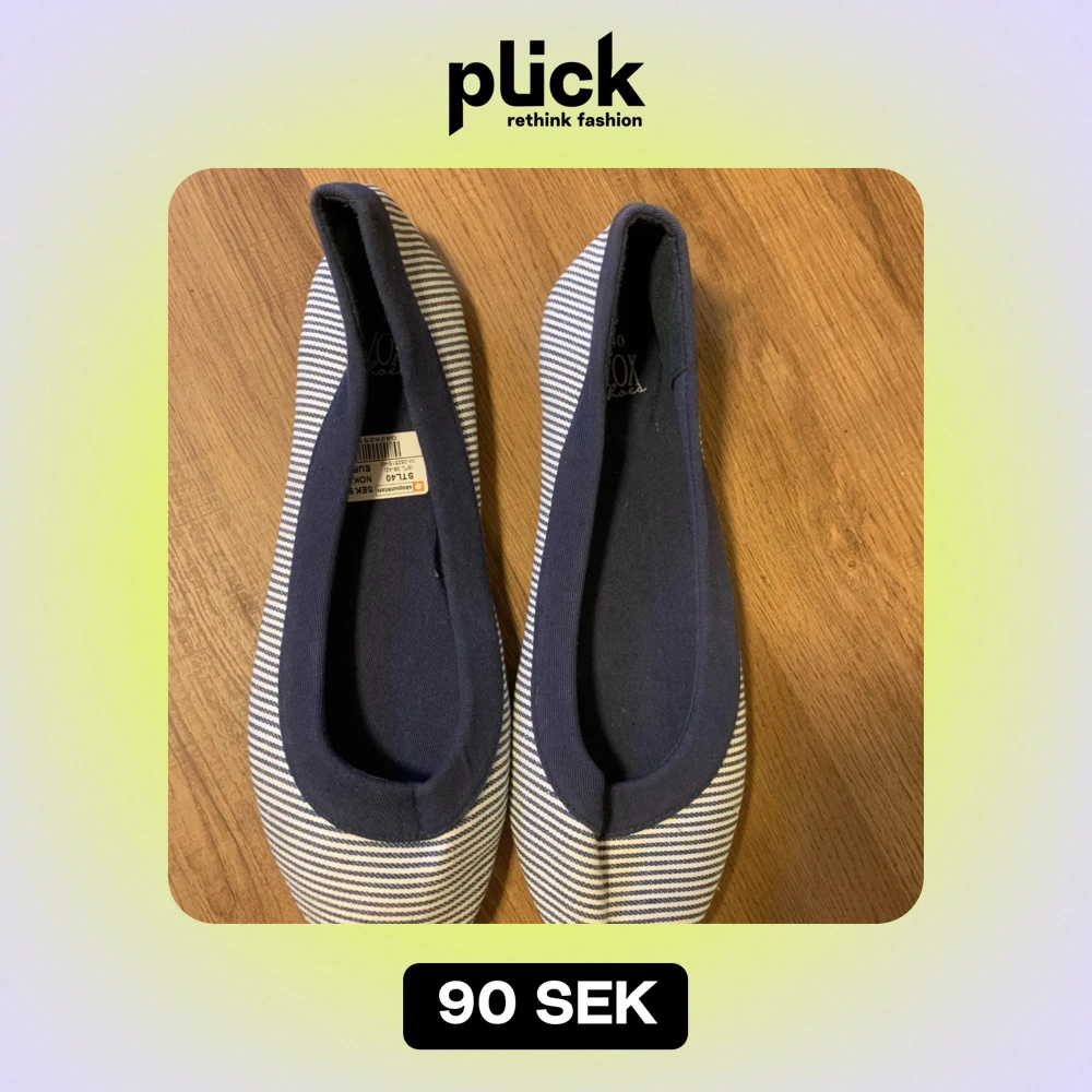 Säljer ett par snygga randiga ballerinaskor från Vox i blått och vitt. De har en klassisk design med rund tå och är perfekta för vår och sommar. Skorna är i mycket bra skick och har en bekväm passform. Perfekta för både vardag och fest!