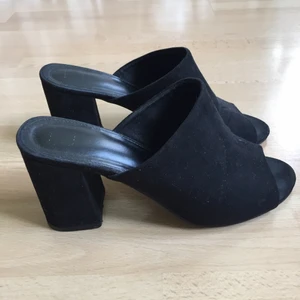 Svarta sandletter med blockklack och öppen tå. Material: mockaimitation. Klackhöjd 9cm