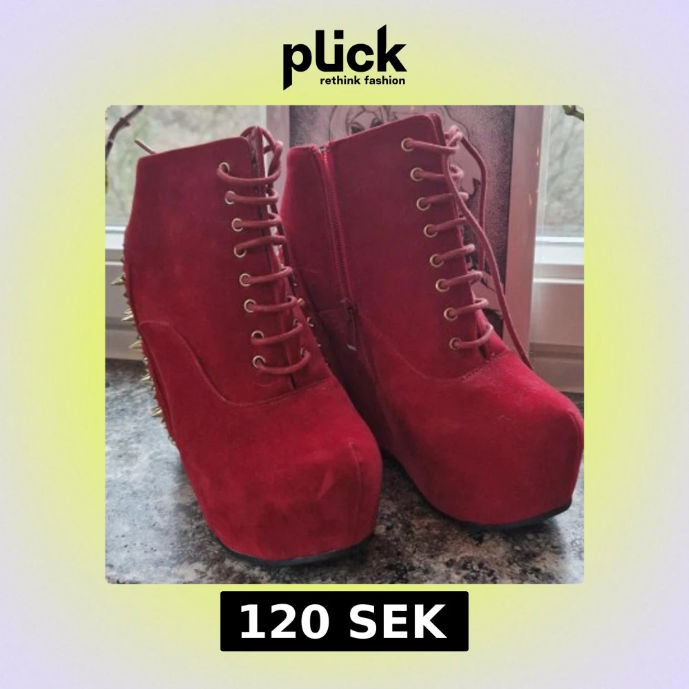 Ikoniska röda platform boots i mocka med nitar i guld från 2010-talet. Bootsen har snörning men också dragkedja på insidan så de är lätta att ta av och på. Platån gör att de är bekväma och lätta att gå i. Aldrig använda så i mycket gott skick!