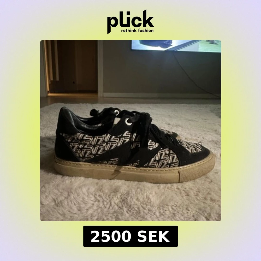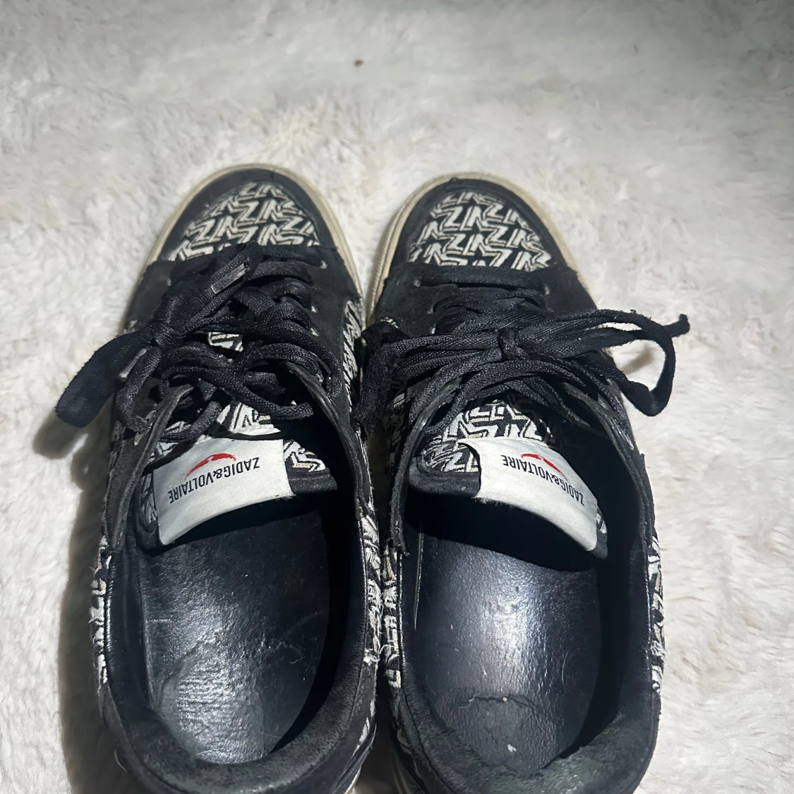 Snygga svarta sneakers från Zadig & Voltaire med coolt grafiskt mönster i vitt och svart på sidorna och tån. Skorna har snörning, rund tå och platt sula. Ovandelen är i mocka och textil, med detaljer i skinn runt hälen. Perfekt för dig som gillar statement-skor.