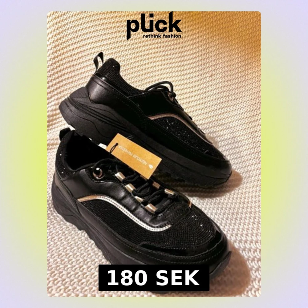 Säljer ett par helt nya svarta sneakers med grov sula och snygga silverdetaljer vid snörningen och längs sidan. Ordinarie pris 449kr aldrig använda, lapp sitter kvar
